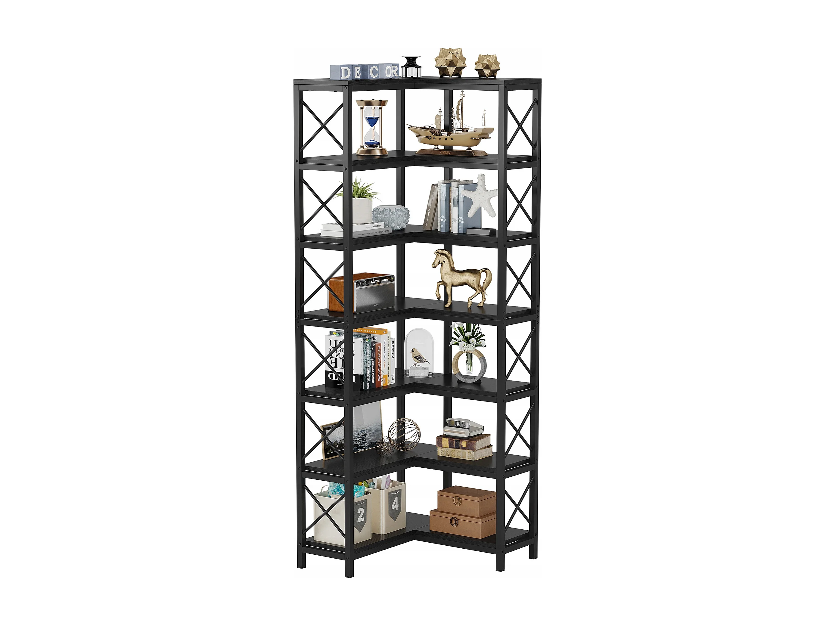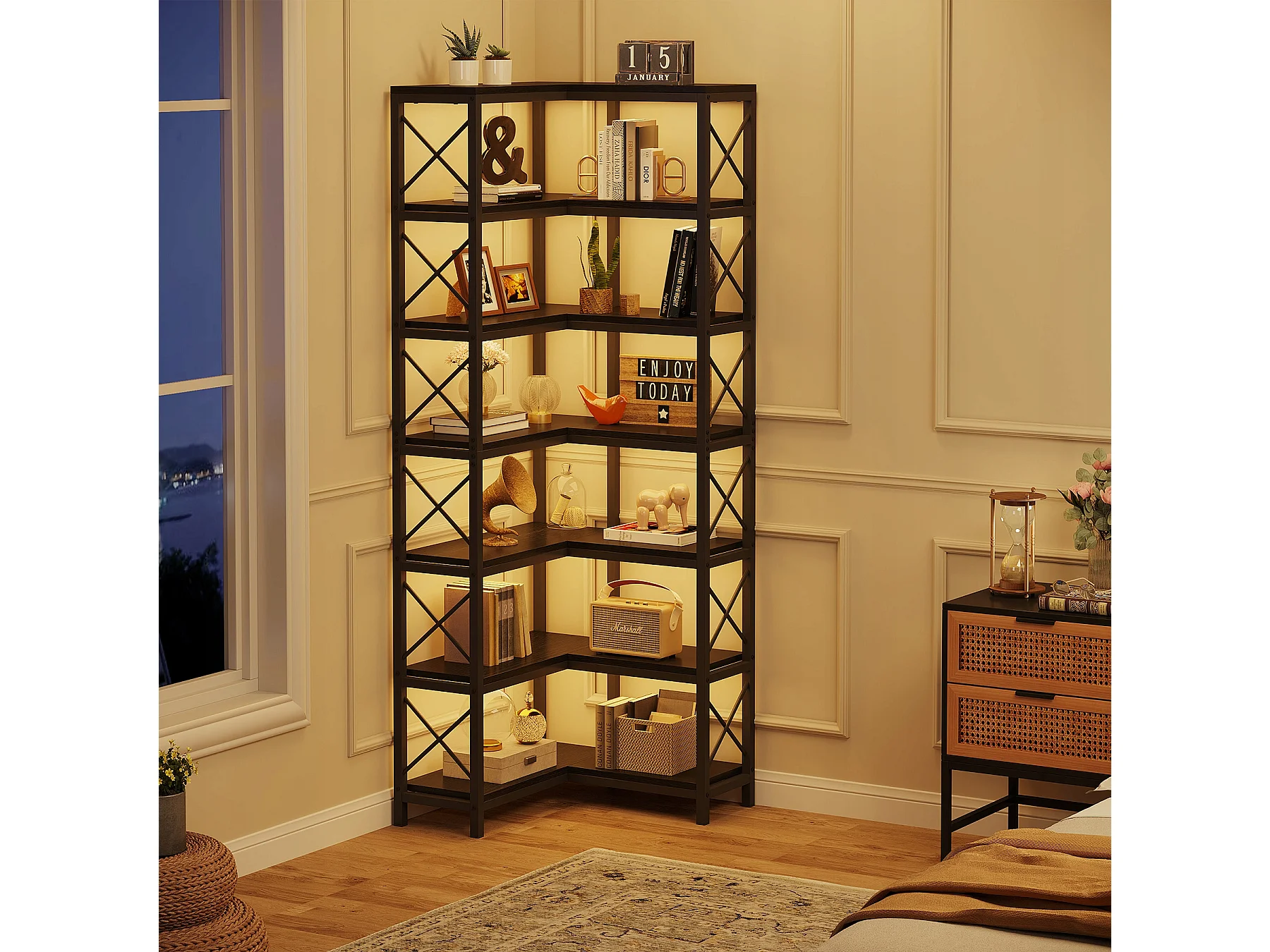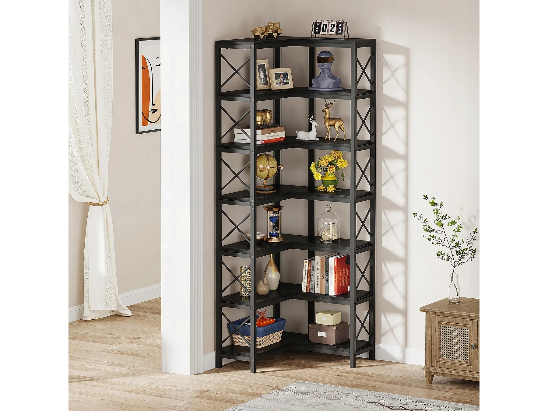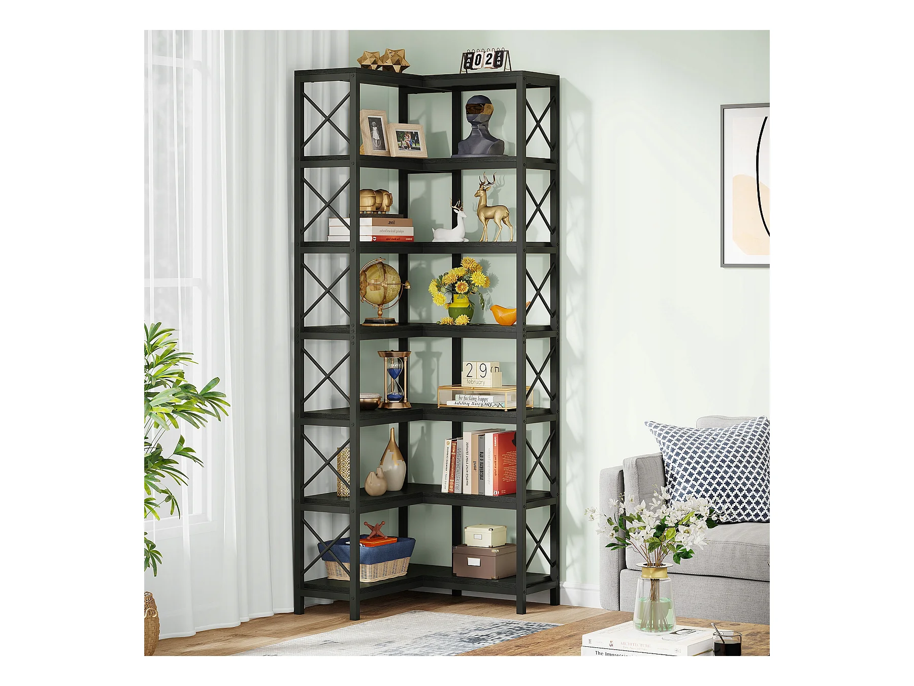 Esquina de biblioteca, gran estantería de esquina industrial, estantería de esquina sobre patas con marco de metal (7 estantes - negro)