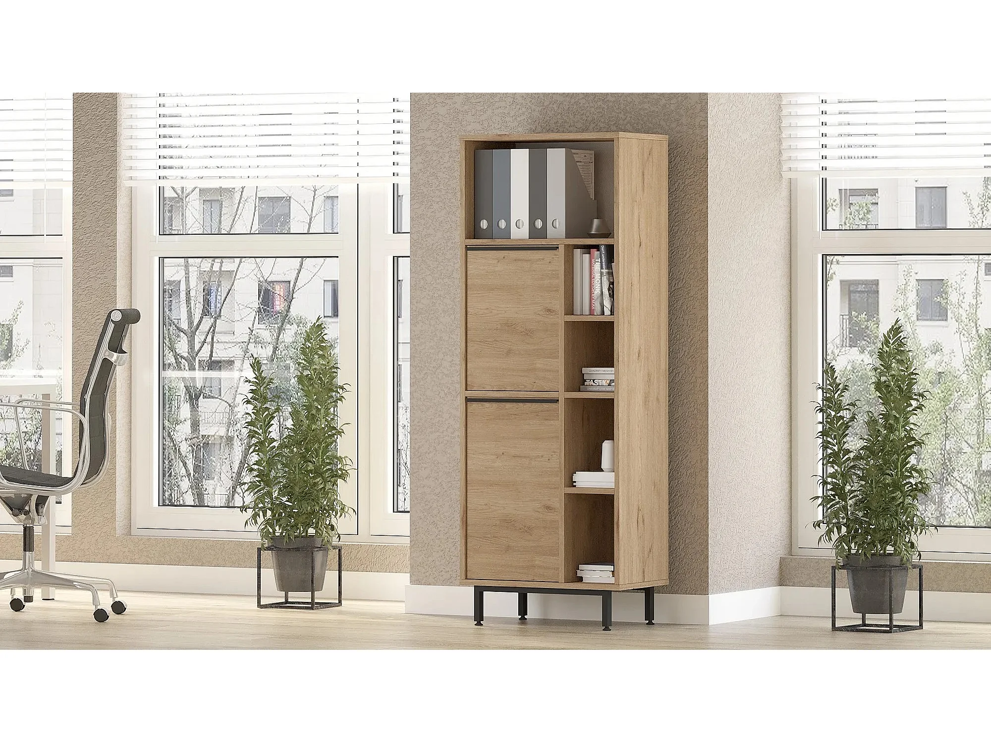 Librería AKORD R15 Blanco 80 cm 2 puertas 2 cajones frente en color Roble Sonoma 7 estantes 80x35x180 cm