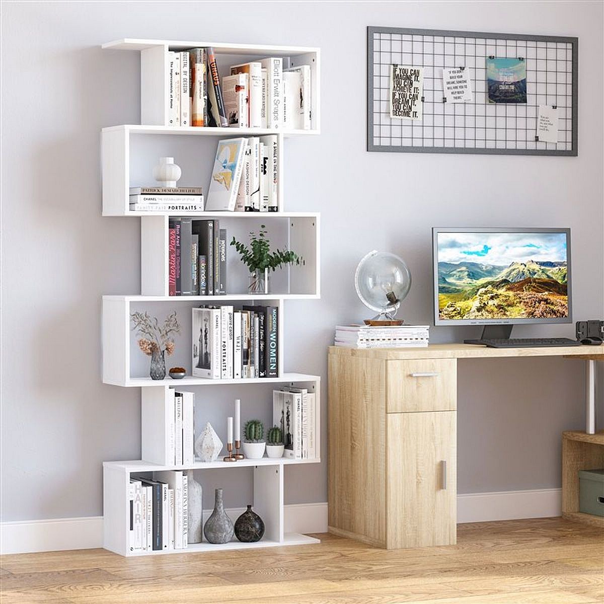 Esta estanteria con forma de S se puede utilizar como una estantería o como armario en tu casa, habitacion, oficina y estudio. Nuestras estanterias y librerias estan hechas de tableros de particulas de alta calidad y son resistentes a los arañazos. Esta libreria tiene 6 estantes, y es una forma sencilla de organizar libros, DVD, marcos de fotos y decoracion del hogar.