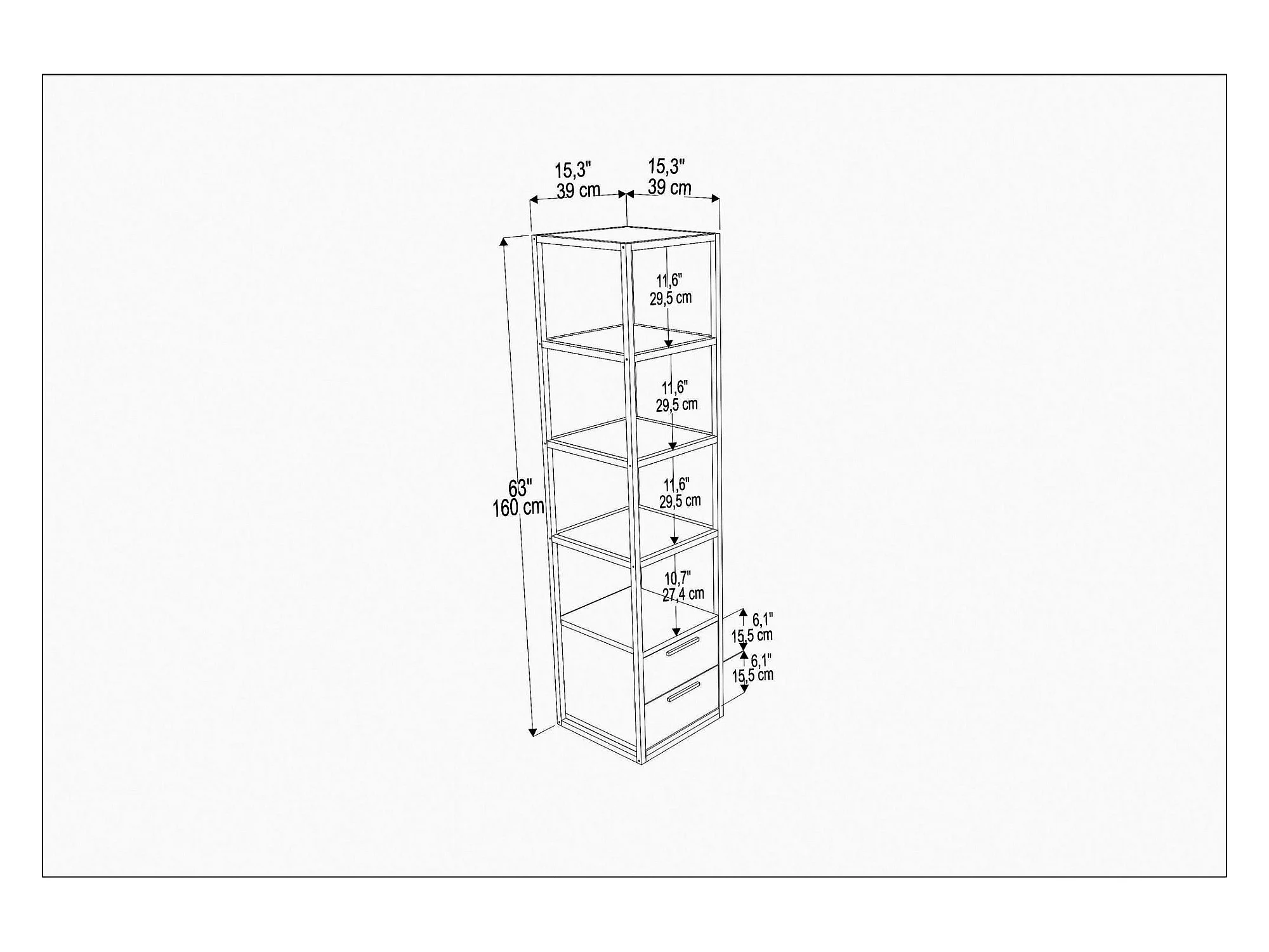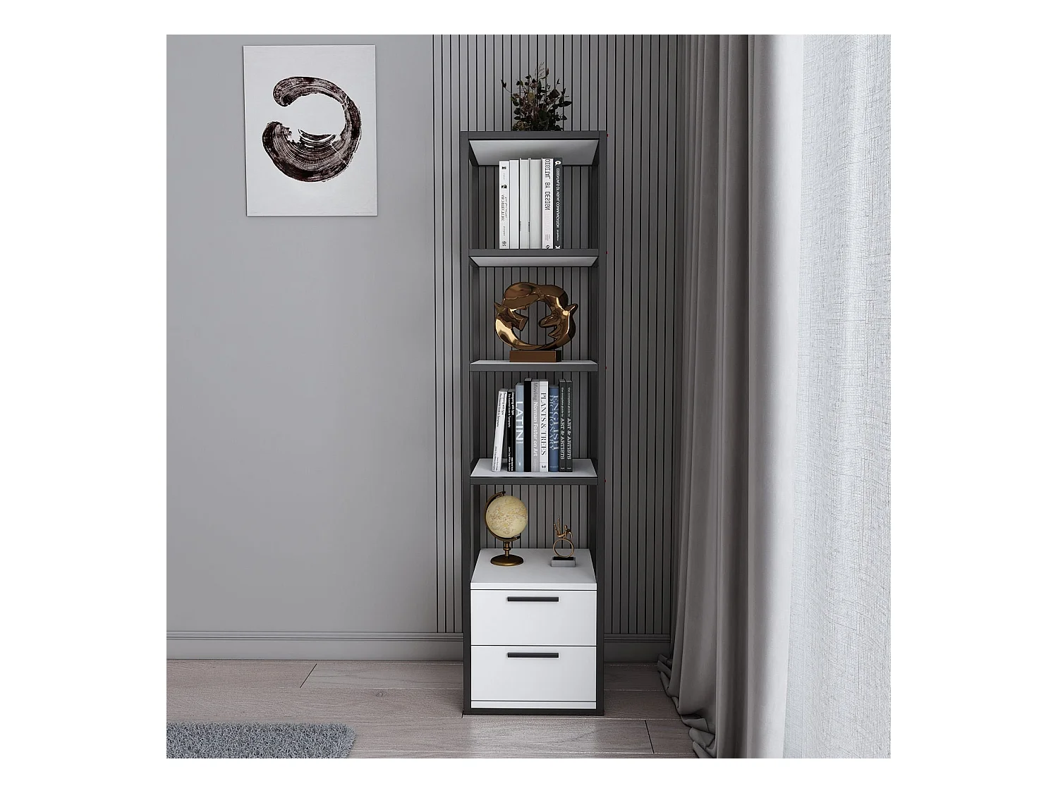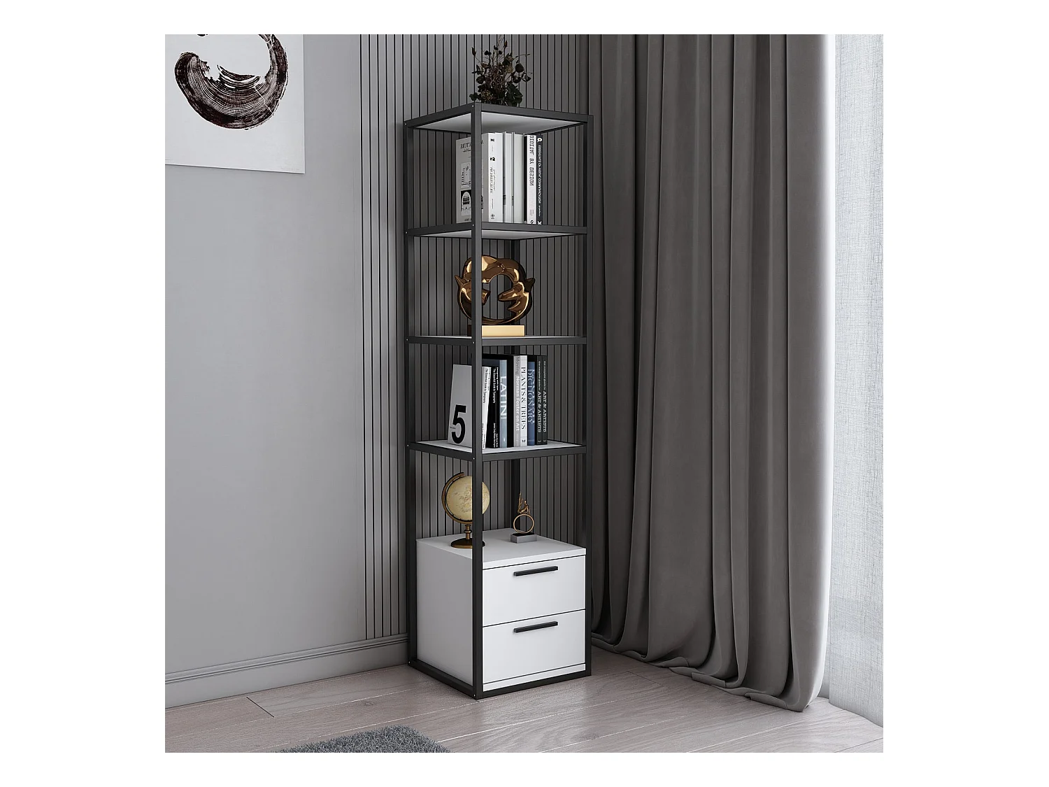 Estantería moderna en blanco y negro, 39 x 39 x 160 cm | Tablero de partículas 100% melaminado, 18 mm de grosor, estructura metálica | Soluc