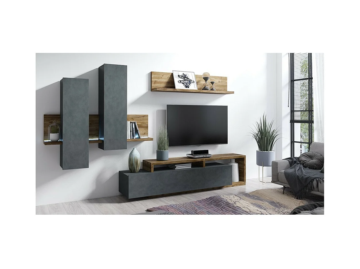 Estantería de pared color roble y negro efecto madera. Colección SANTIAGO.