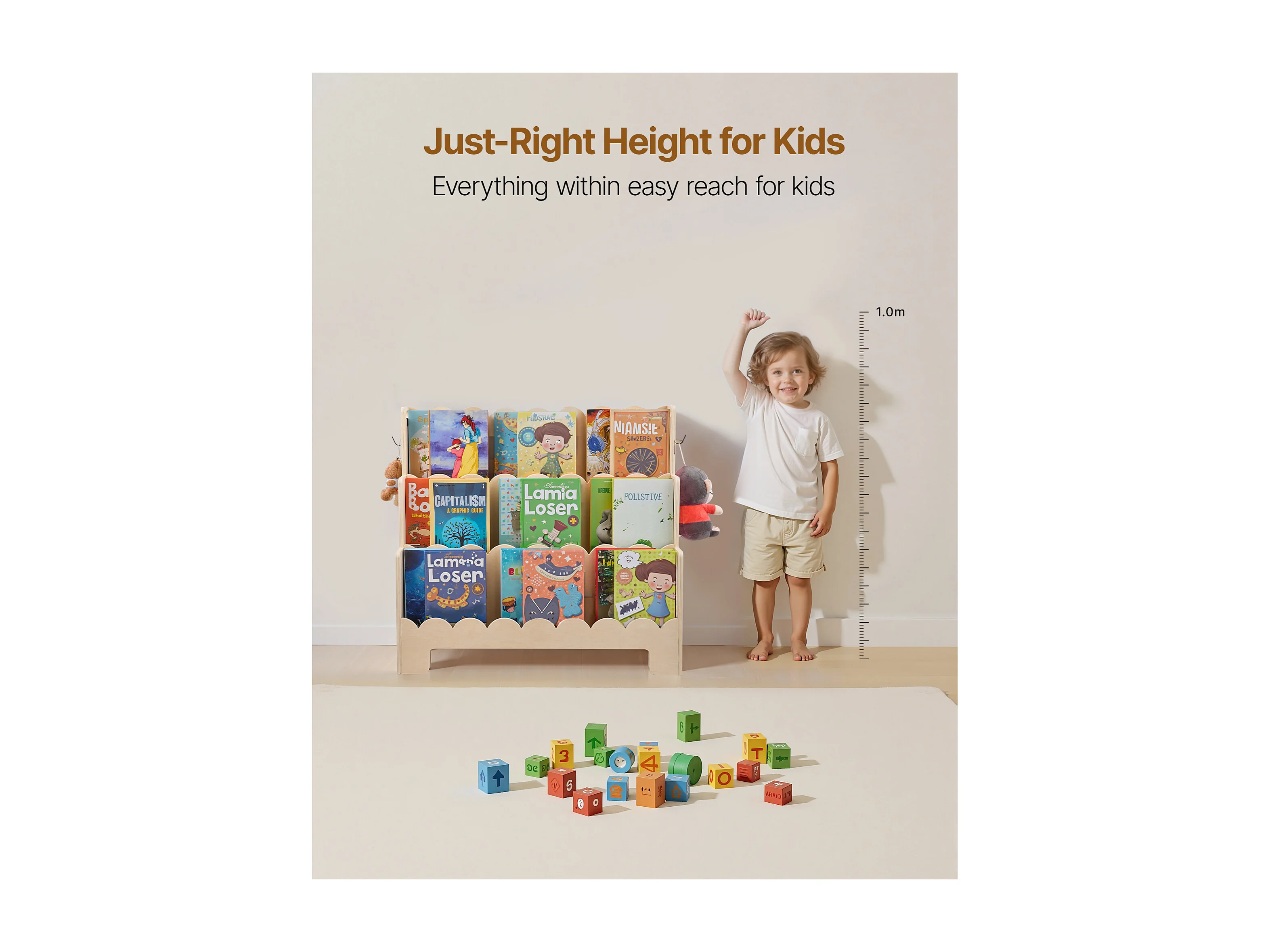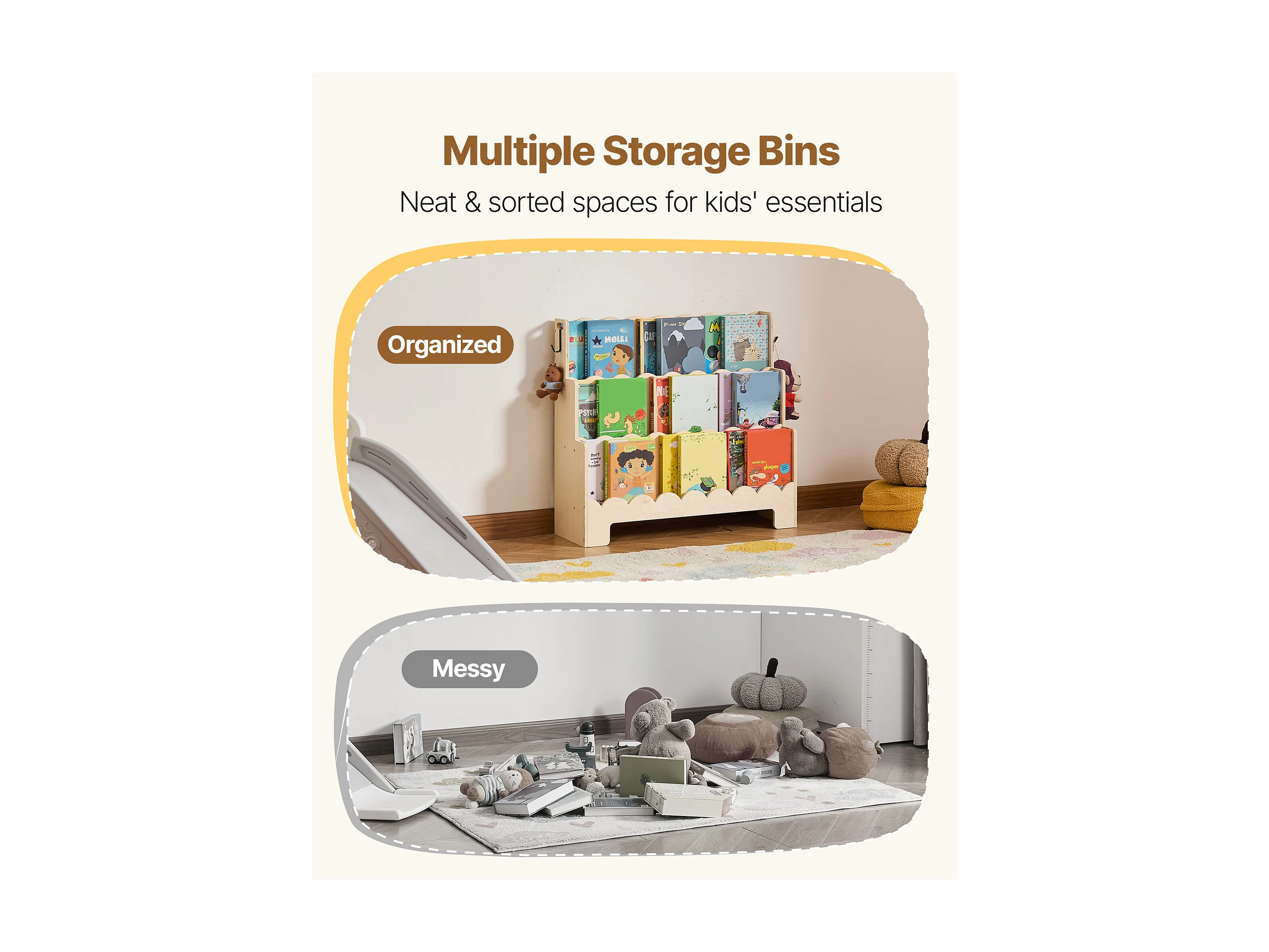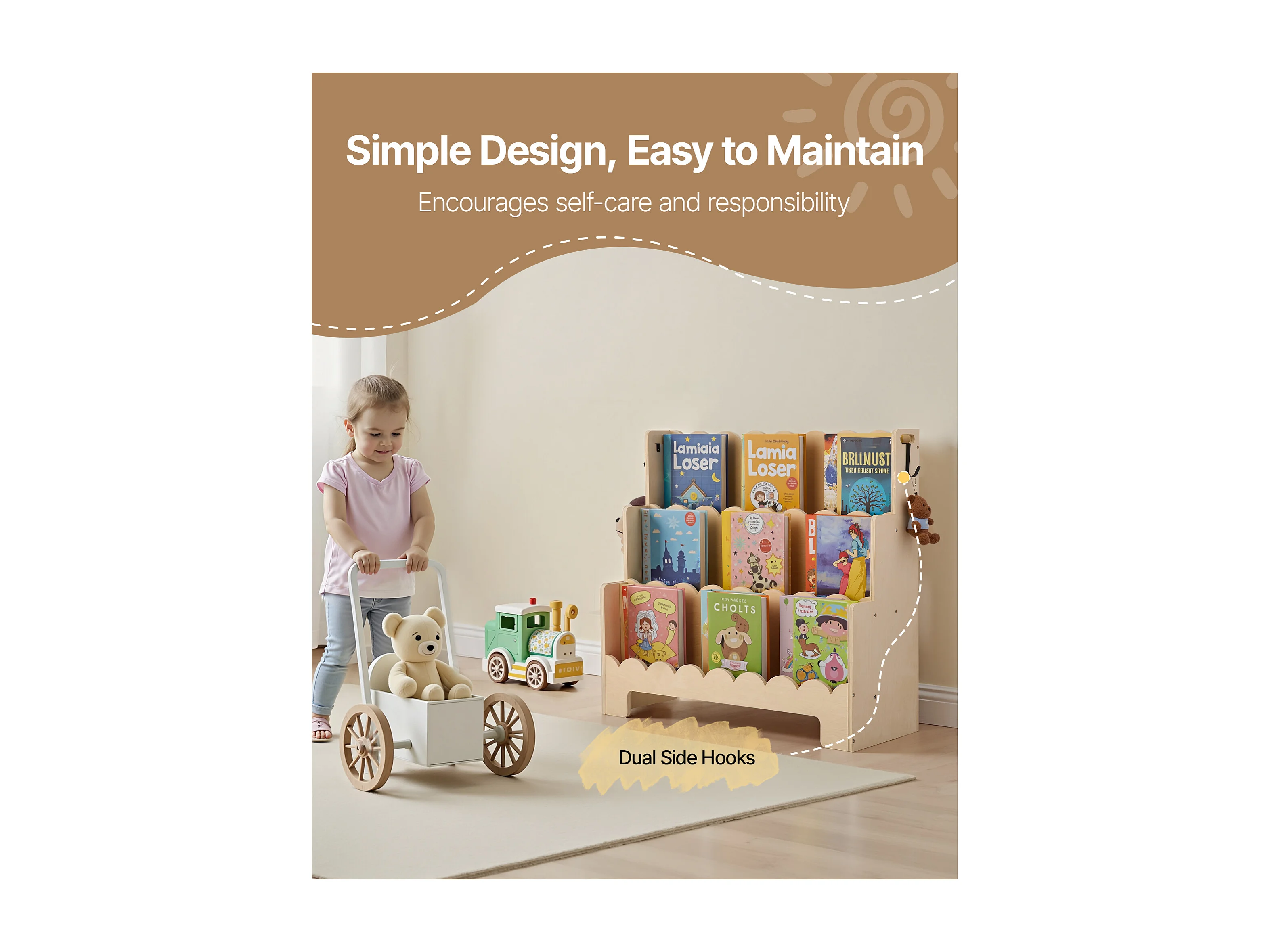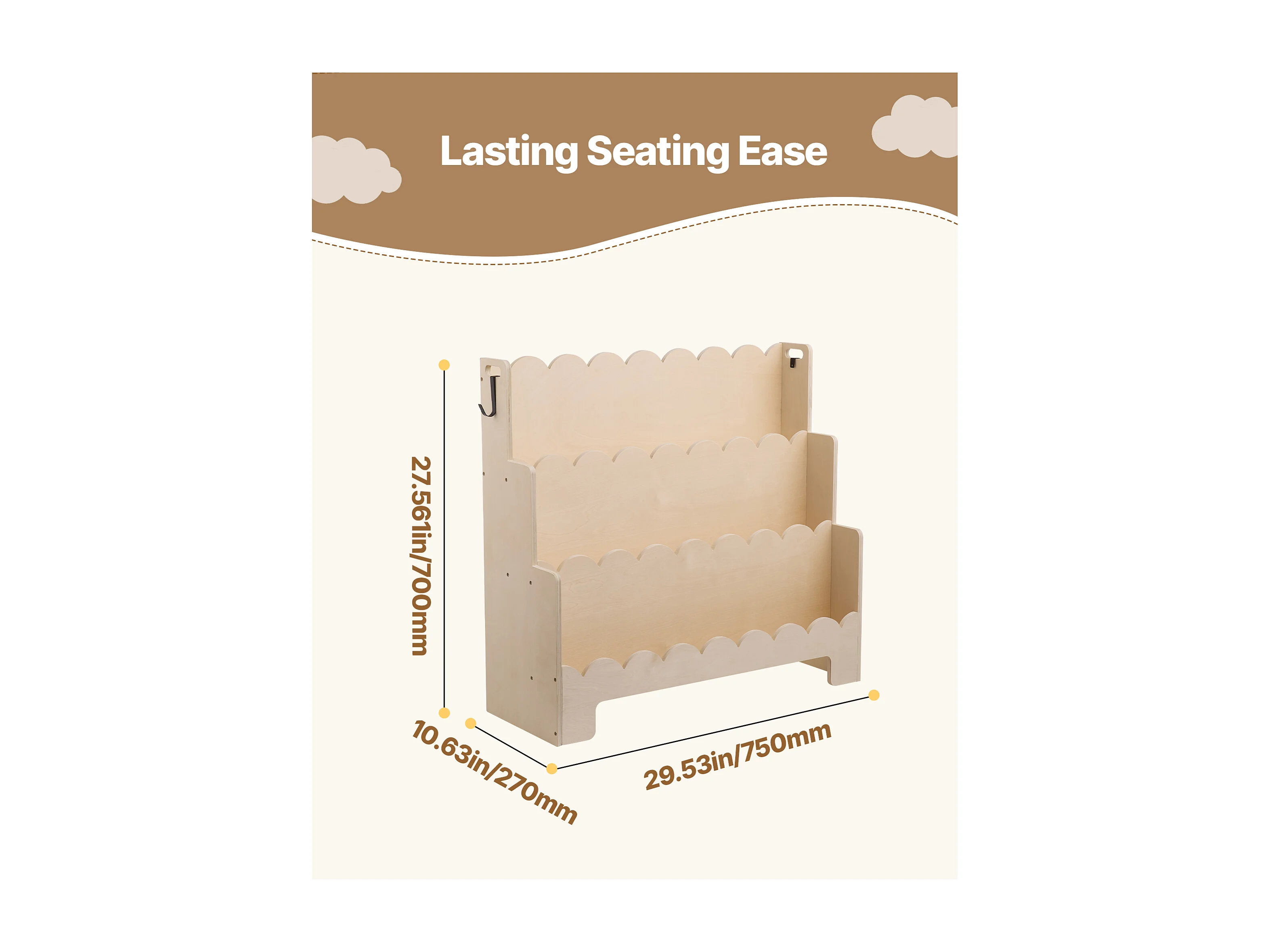 Estantería para Libros SucceBuy para Niños Pequeños Orientada hacia Adelante, Biblioteca Festoneada para Niños a 3 Niveles con 2 Ganchos para Colgar Mochilas
