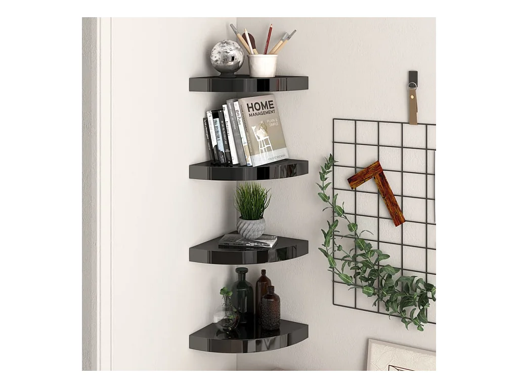 Estantes de pared esquina 4 uds MDF negro brillo 25x25x3,8 cm ES29531