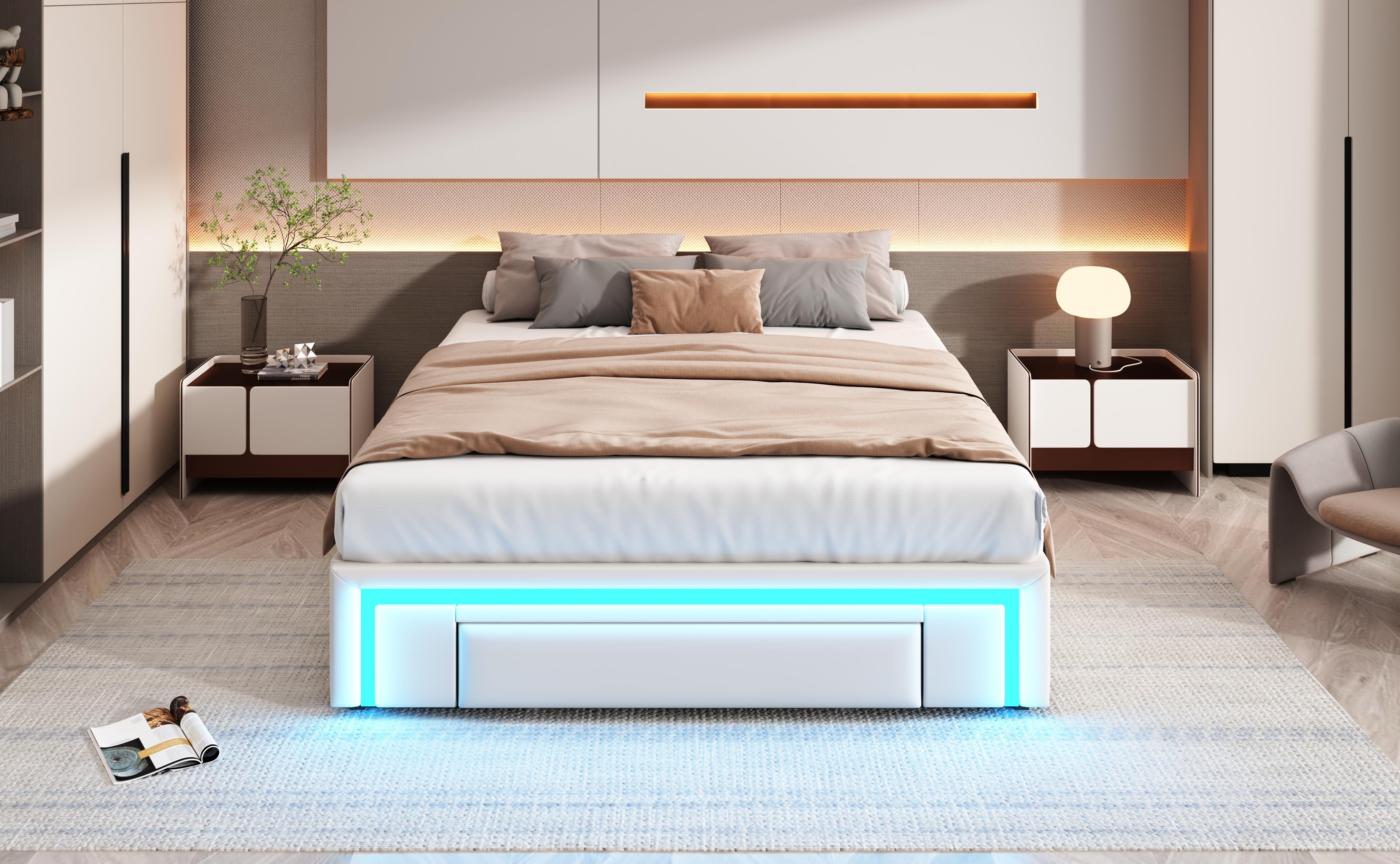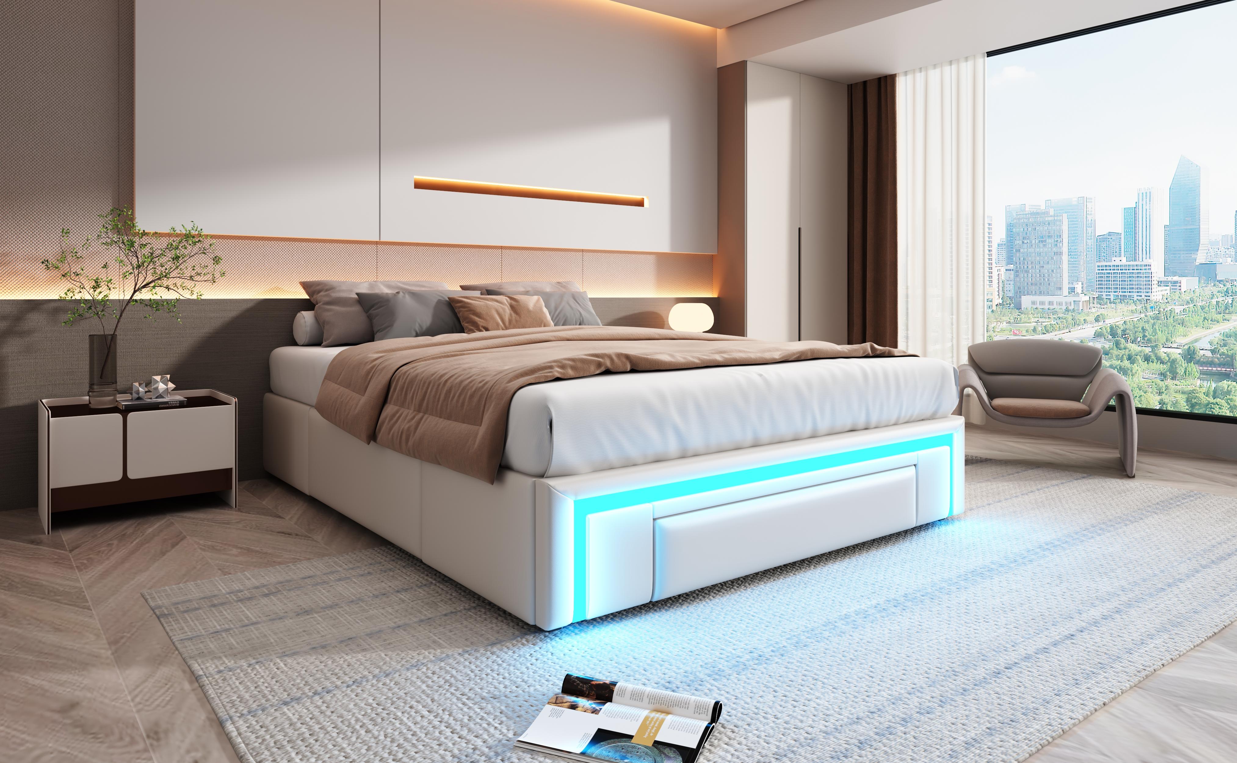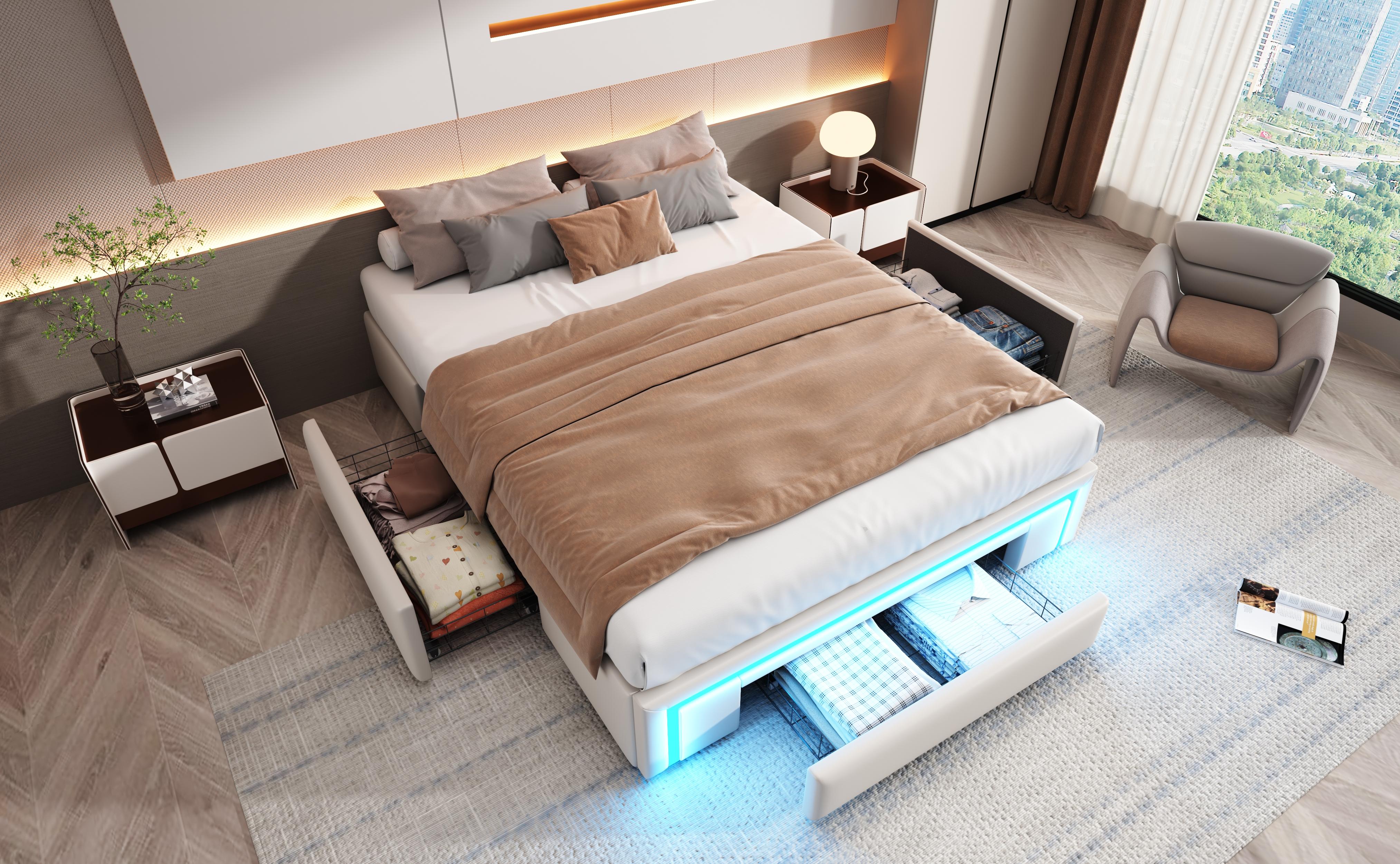 Cama doble 140x200cm tapizada con base, 4 cajones, cabecero con iluminación LED, color beige