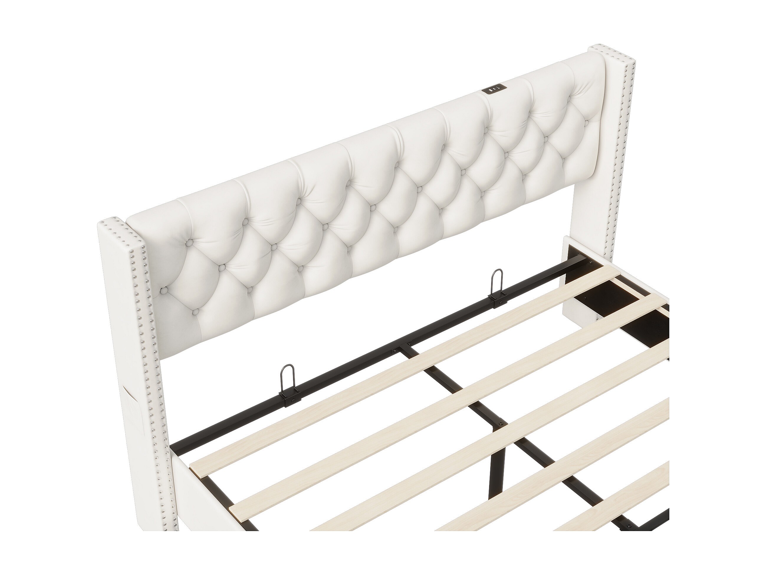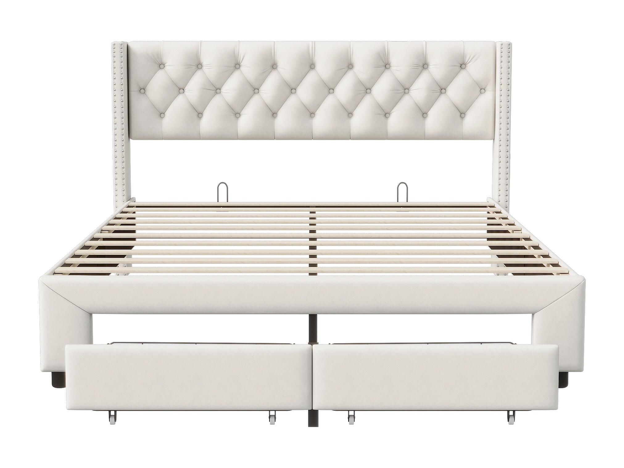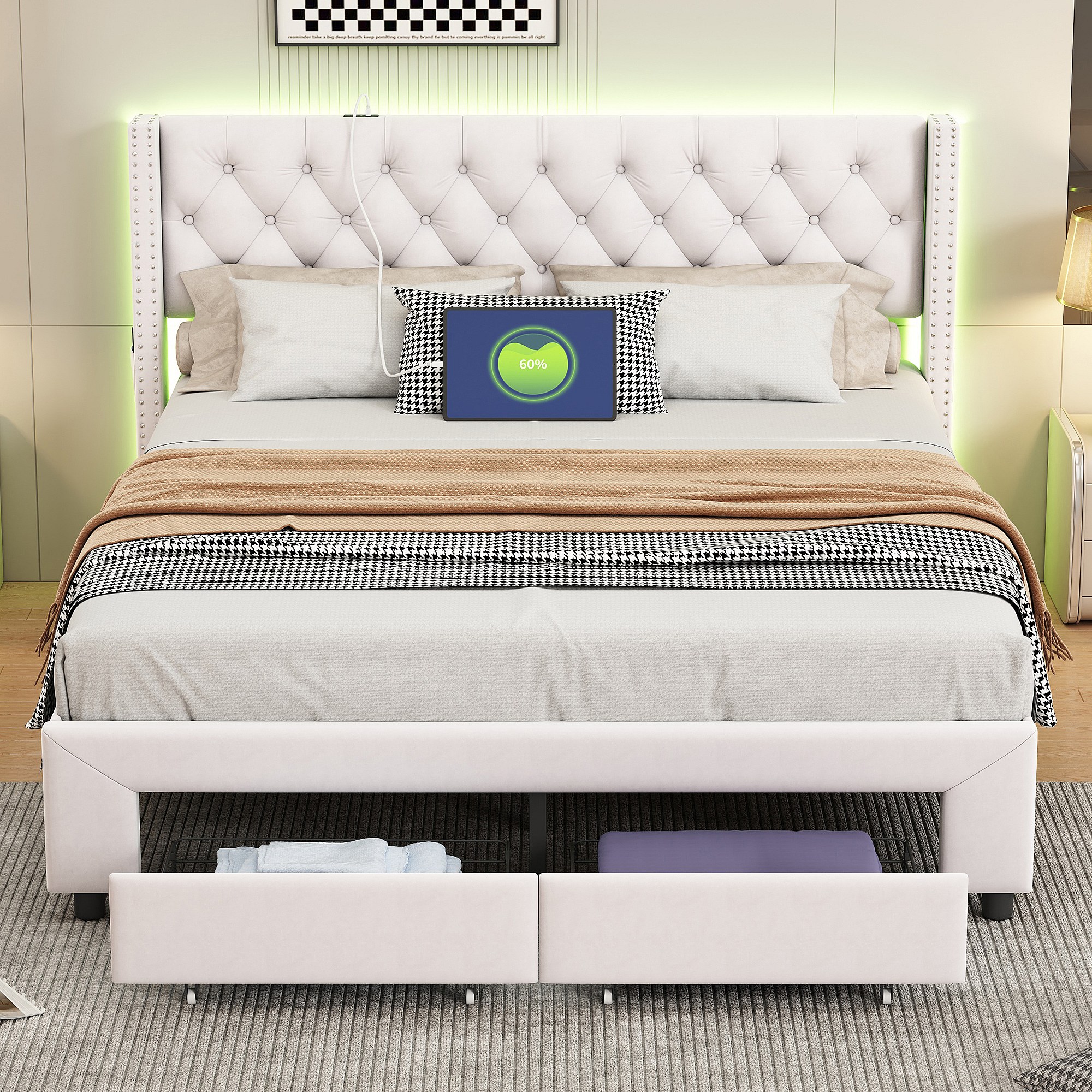 Estructura de cama de 160 x 200 con cajones, tapizada con LED y USB, tapizada en terciopelo, color beige