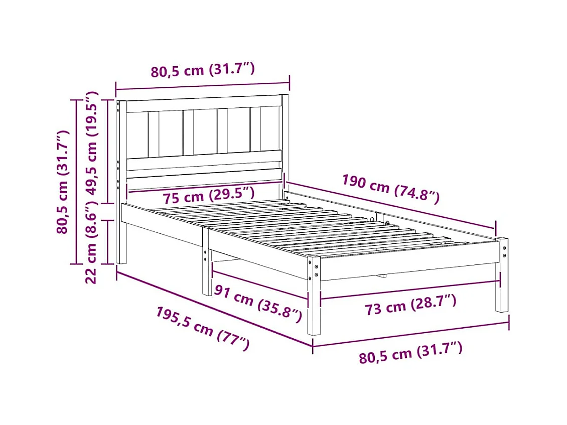 Estructura de cama Marrón 75 x 190 cm Madera maciza de pino