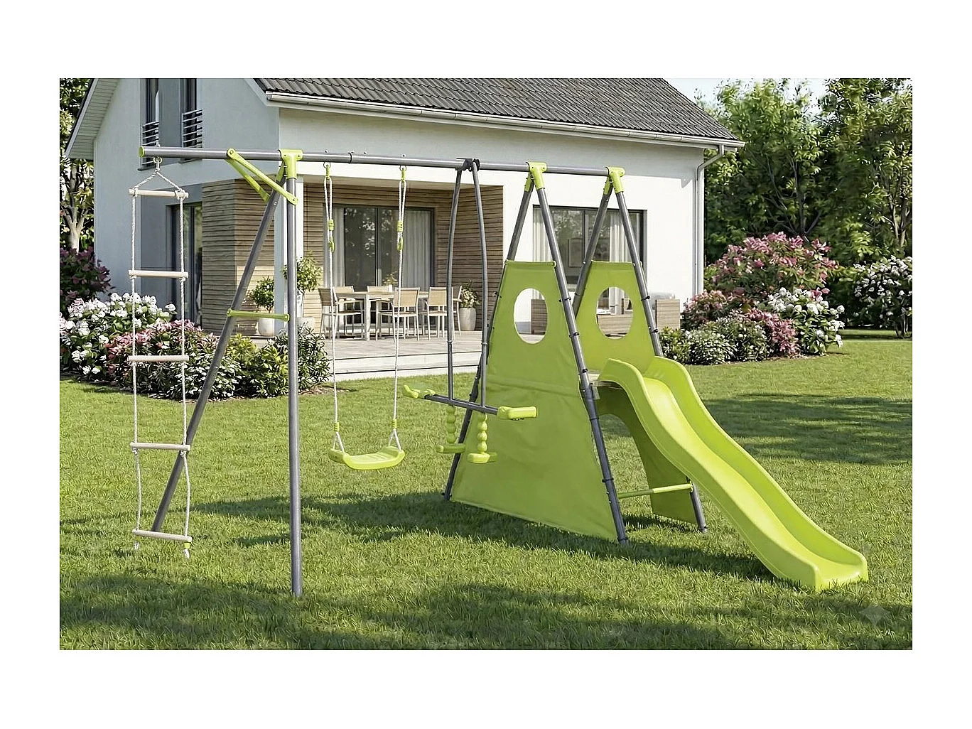 Estructura de juego metálica "Dany" con tobogán - 5 aparatos - Verde