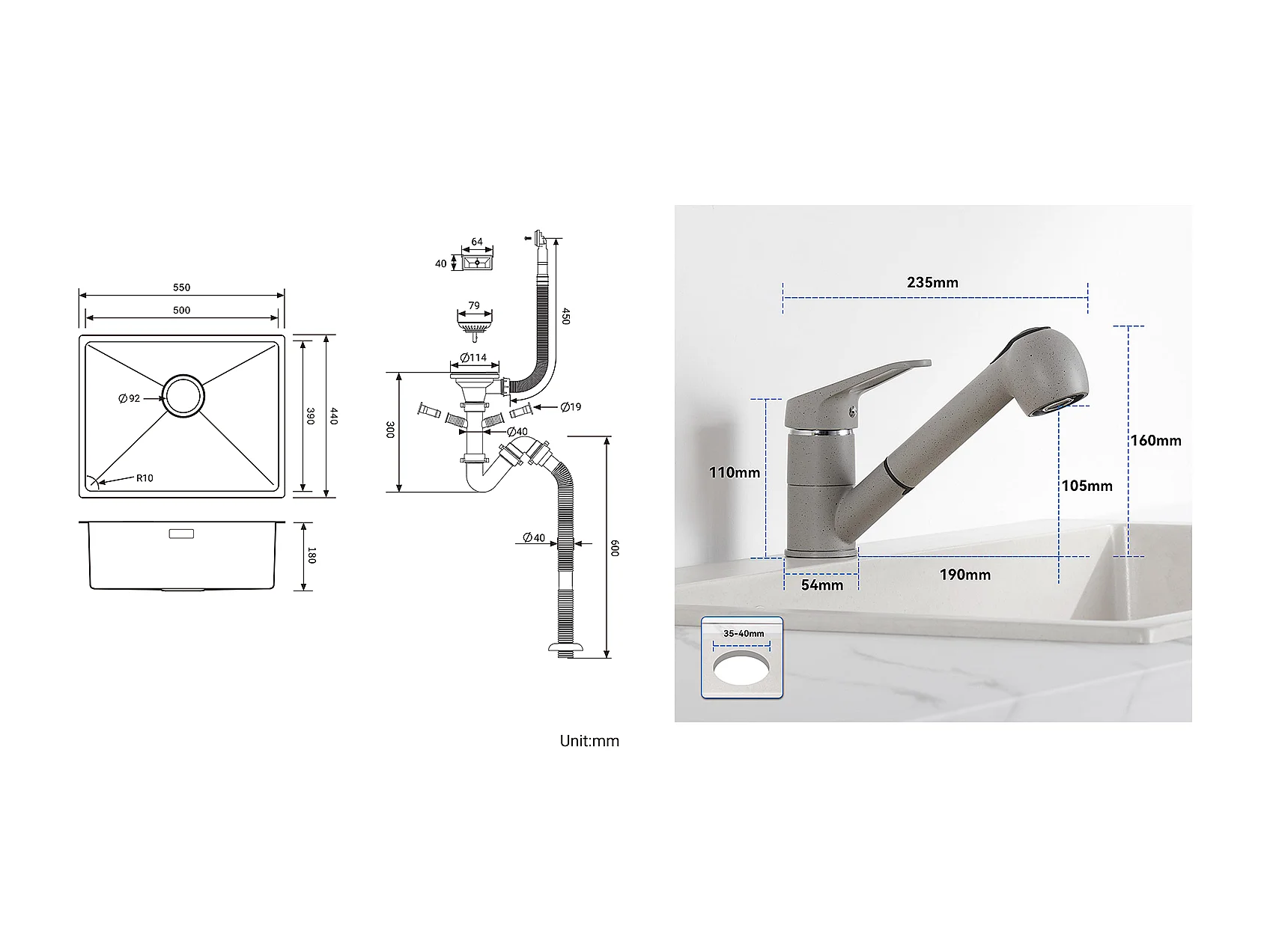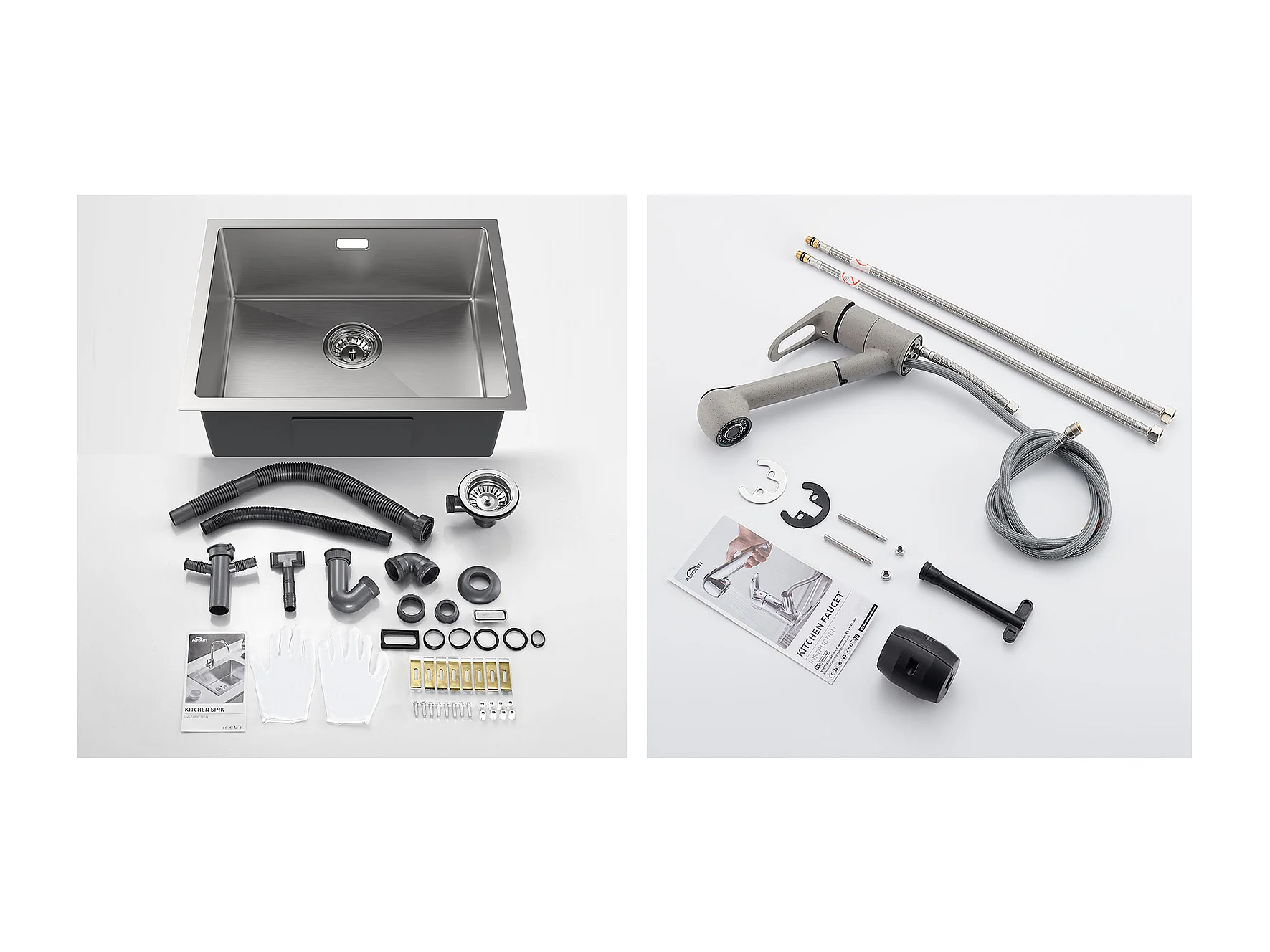 Fregadero Cocina 1 Bandeja 55*44*19CM, Empotrable/Flor/ Sub-Plan, Cepillado+Grifo Cocina con Ducha Extraíble 2 Jets, Agua Fría/Caliente, Gris
