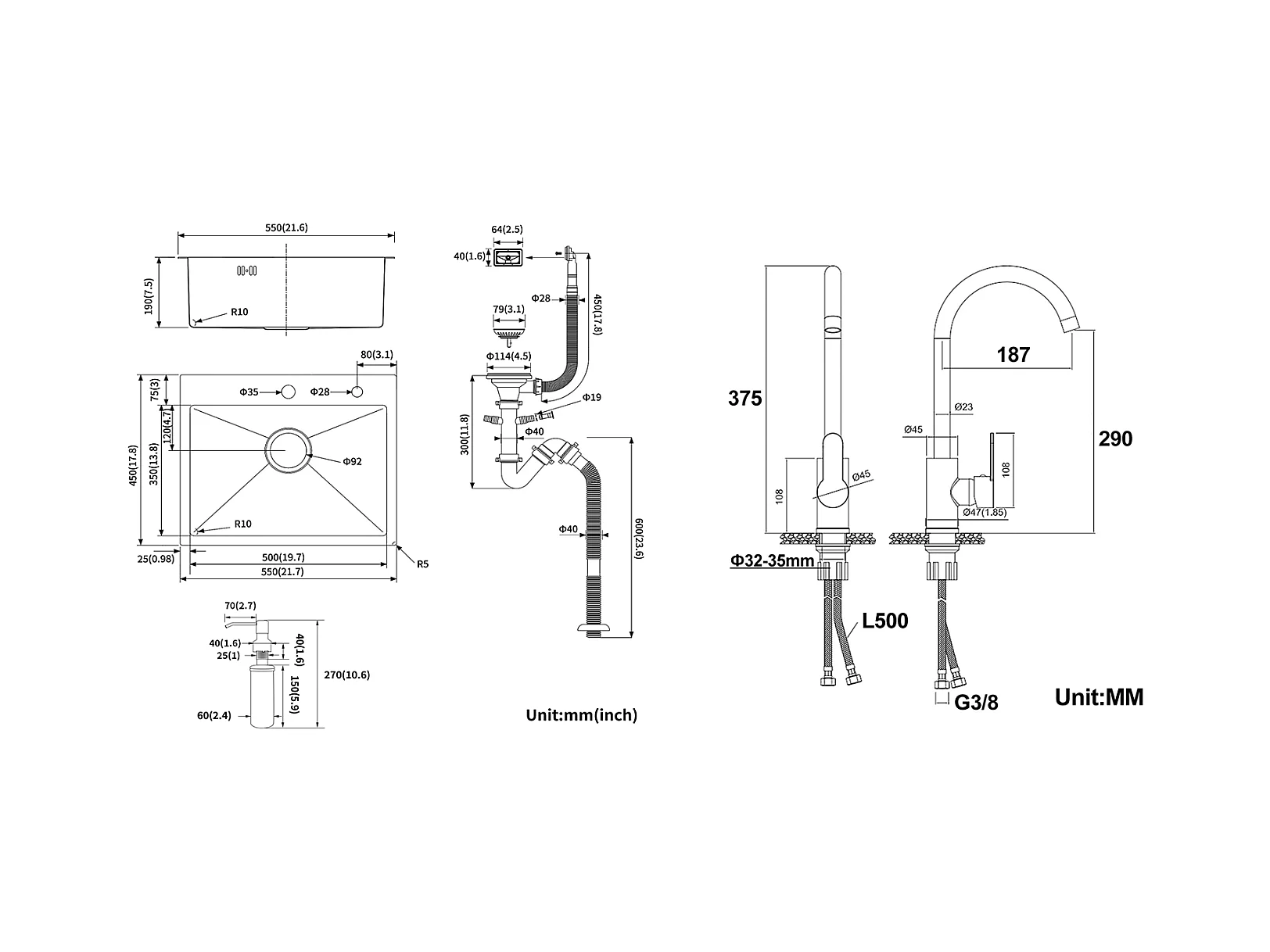 Fregadero CuiSine 1 Bandeja 55*45CM Fregadero empotrado y de colocar con dispensador de jabón + Grifo de cocina giratorio 360°, Negro