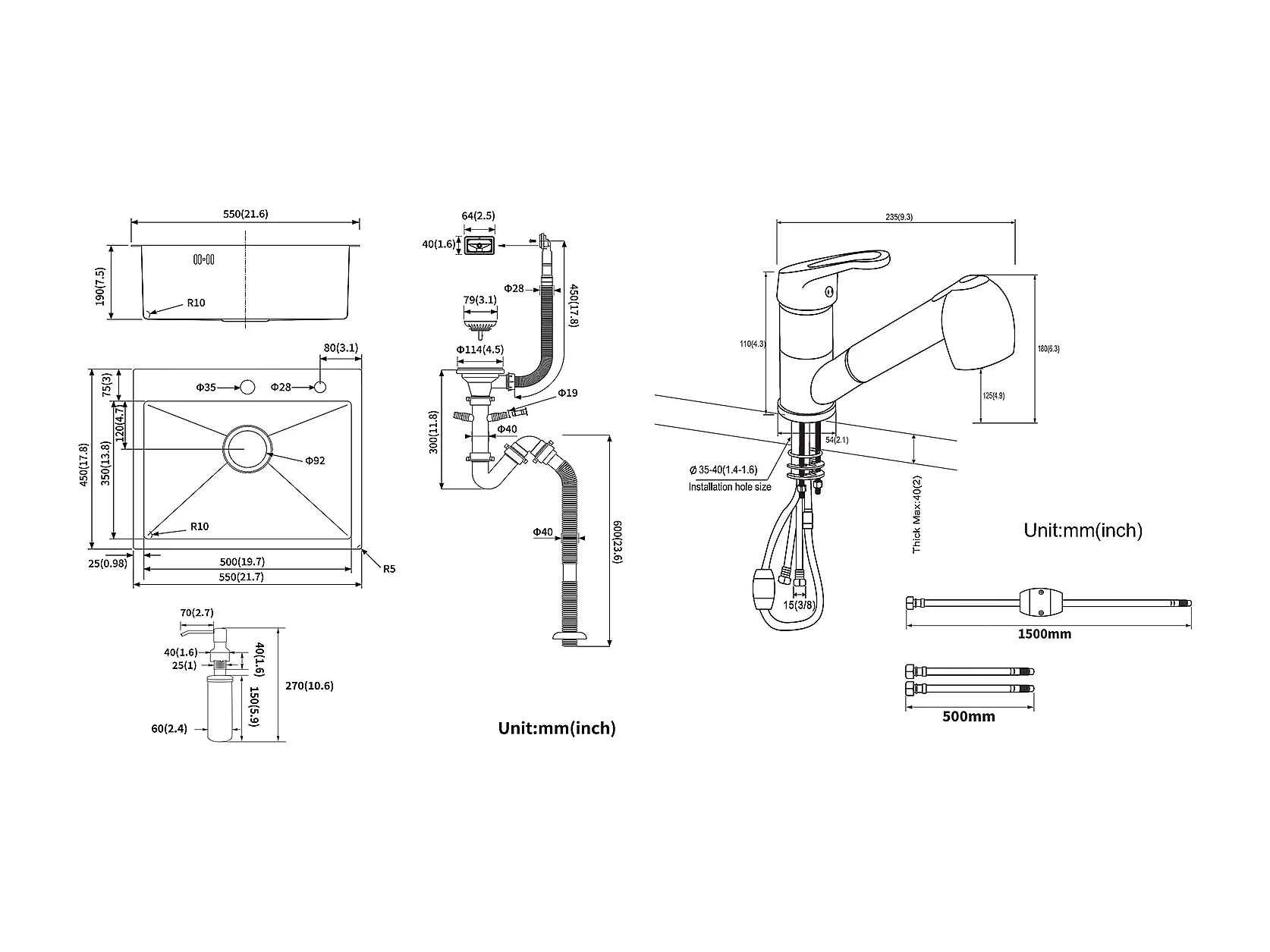 Fregadero Cocina 1 Bandeja 55*45CM Negro+RObinet de Cocina Negro con Ducha Extraíble 2 Jets de 360° en Latón, Agua Fría y Caliente