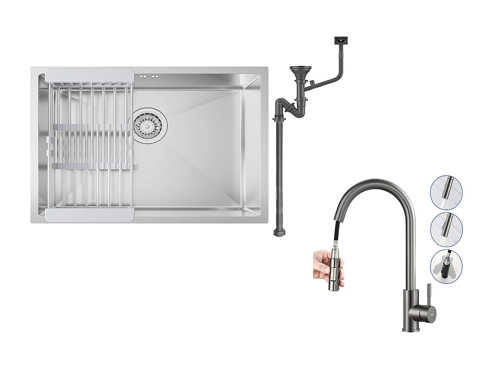 Auralum max Fregadero Cocina 1 Bandeja 60*44*20CM,inoxidable, empotrado/subplano con Cesta drenaje,Nano Silver+Mezclador Cocina Plegable Girante 360°