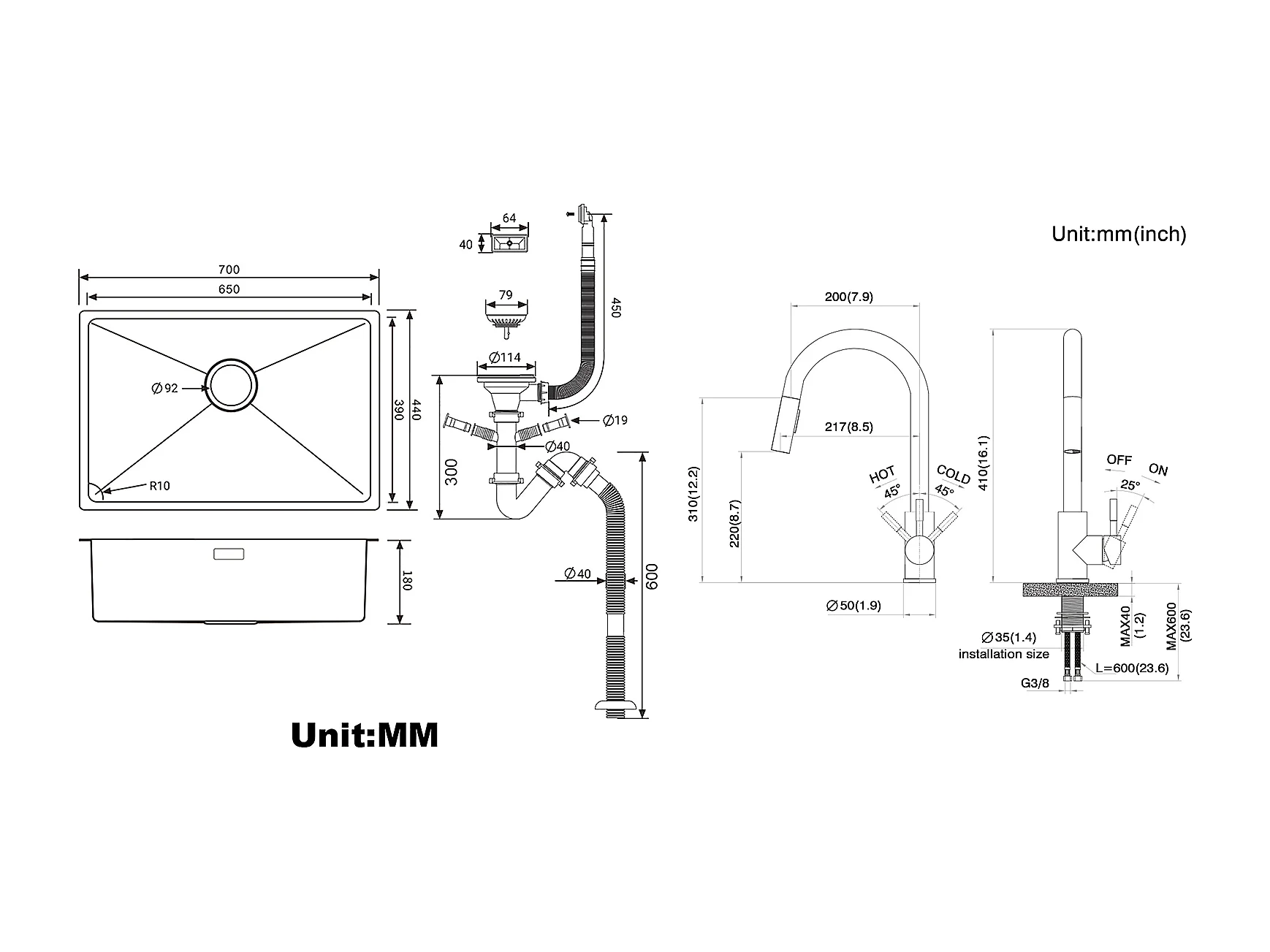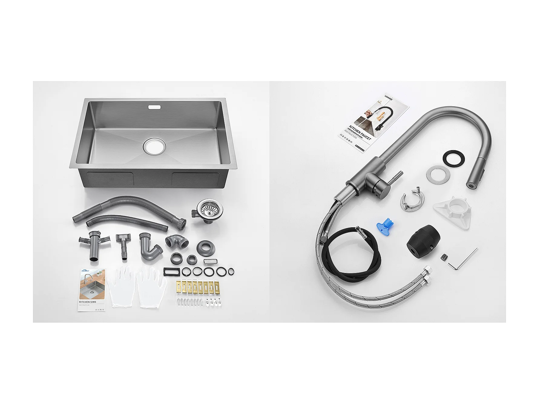 Fregadero Cocina 1 Bandeja 70*44*19CM, Empotrable/Fleur/Sous-Plan,con Sifón/Trop-Plein,Cepillado+Grifo Cocina Ducha Extraíble Gris Oscuro