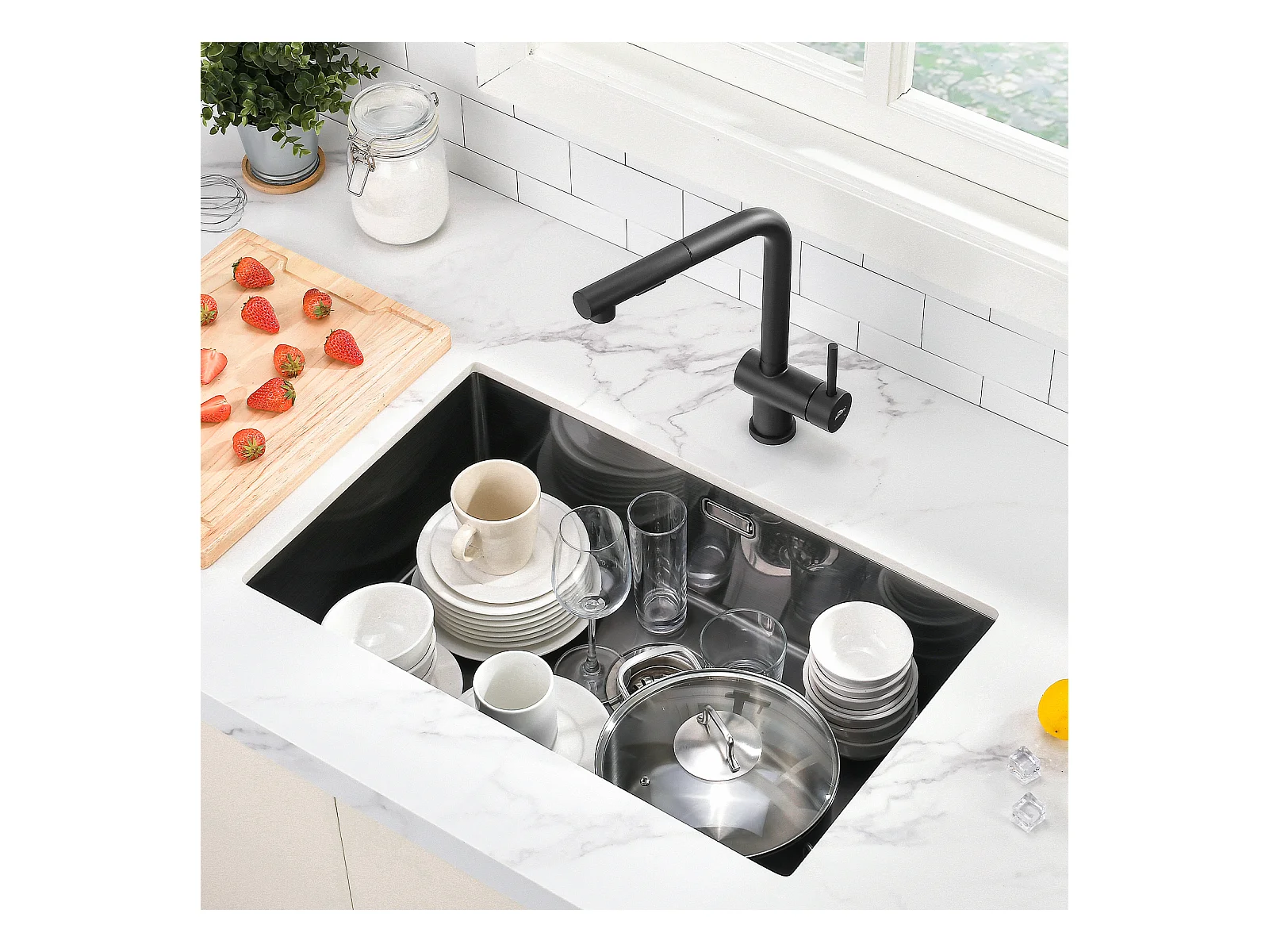 Fregadero Cocina 1 Contenedor 70*44*19CM, En Encastrer/Fleur/Sous-Plan,Siphon/Trop-Plein+Grifo de cocina con ducha extraíble,Negro