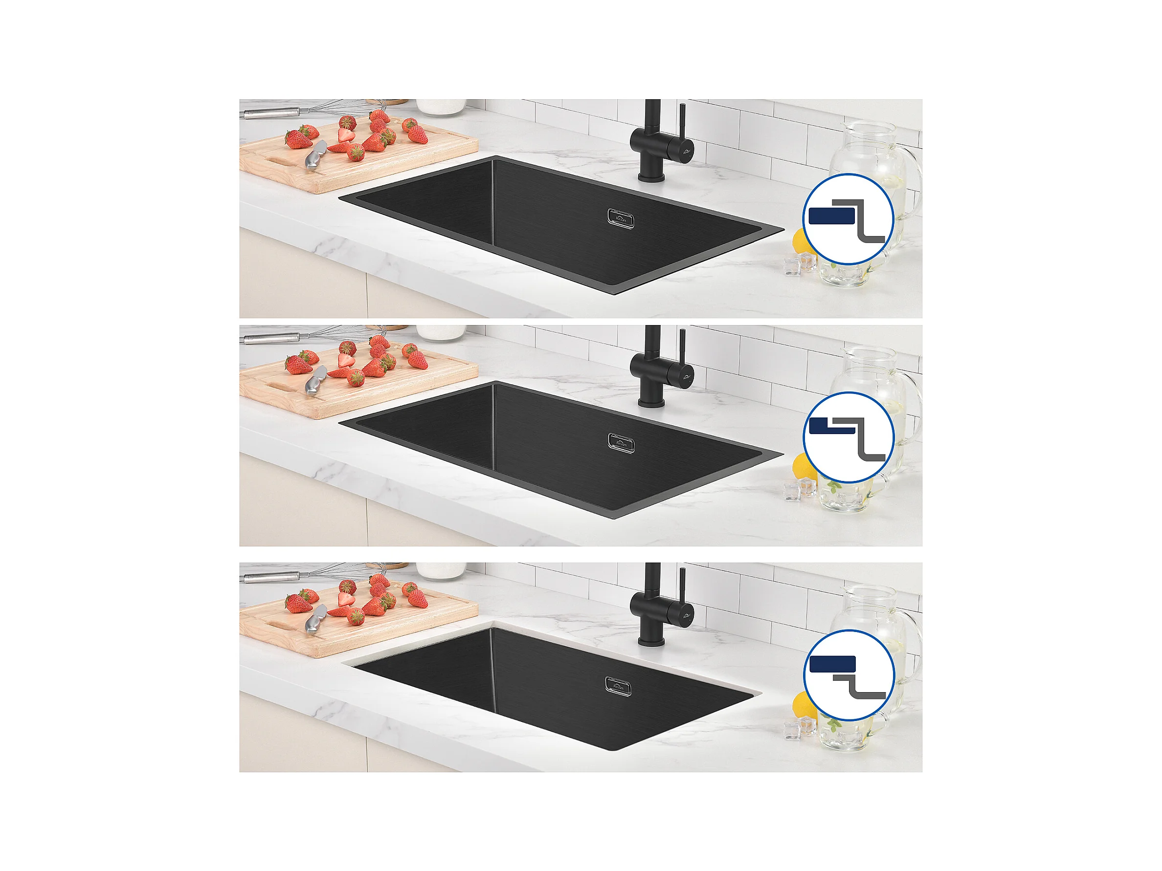 Fregadero Cocina 1 Bandeja 70*44*19CM,para Empotrar/Fleur/Sous-Plano,Sifón/Trop-Plein+Grifo Cocina,Orientable 360°,Agua Caliente/Fría,Negro