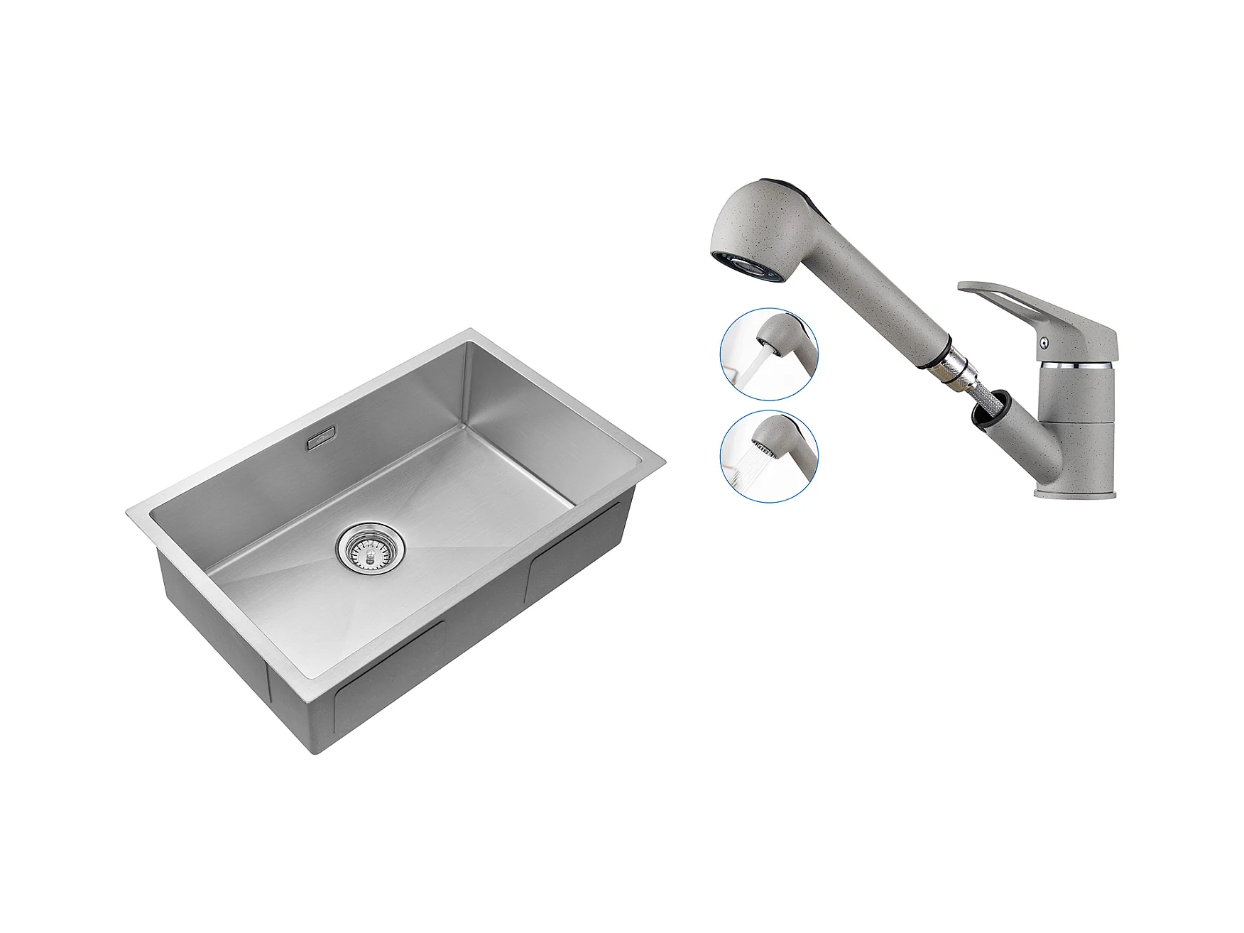 Fregadero Cocina 1Bac 70*44*19CM, para Empotrar/Flor/Sous-Plan,con Sifón/Trop-Plein+Grifo Cocina con Ducha Extraíble 2 Jets, Gris
