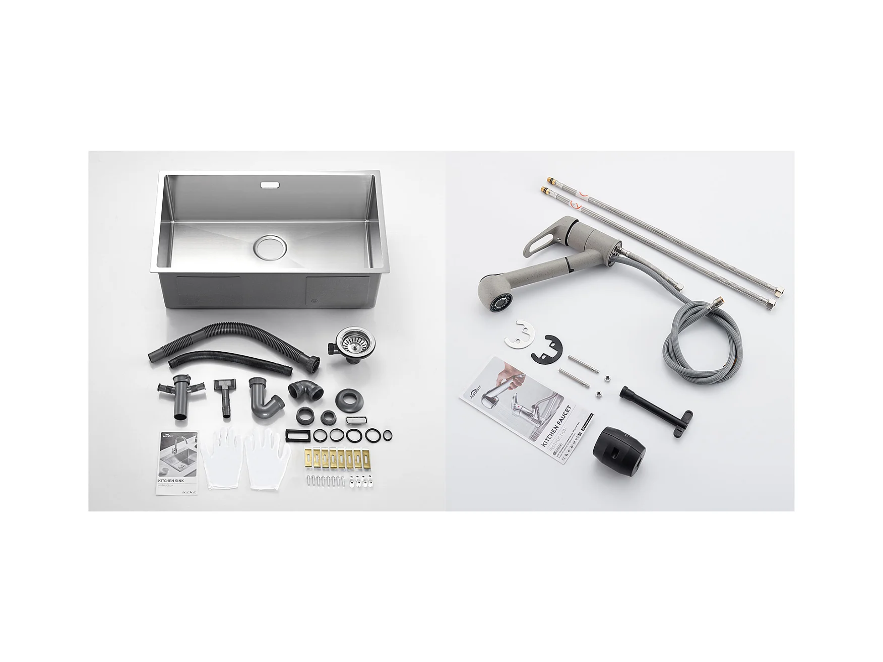 Fregadero Cocina 1 Contenedor 70*44*19CM, En Encastrer/Fleur/Sous-Plan,Siphon/Trop-Plein+Grifo de cocina con ducha extraíble,Negro