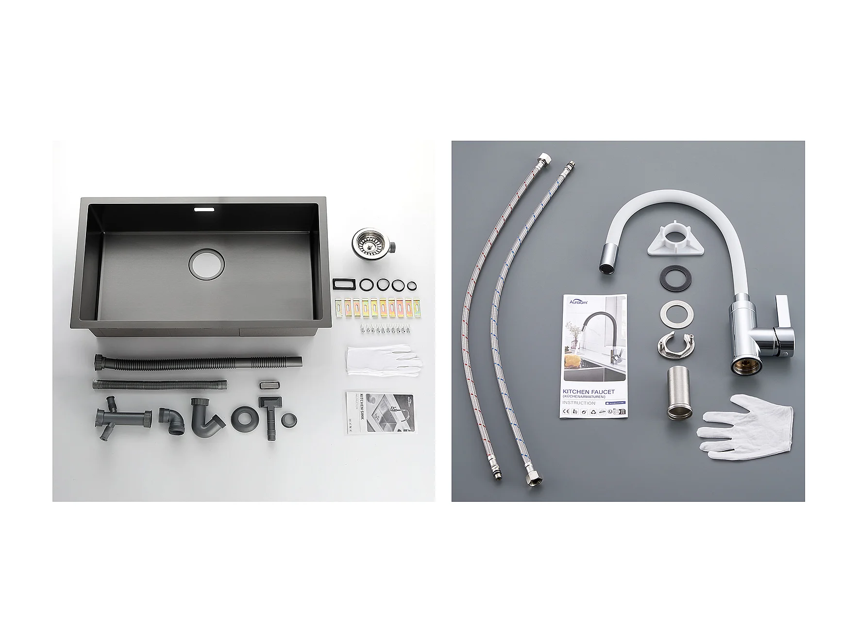 Fregadero Cocina 1Bandeja 70*44*19CM,para Empotrar/Fleur/Sous-Plan,con Sifón/Trop-Plein+Grifo Cocina FLegible Boco Alto Orientable Libremente, Blanco