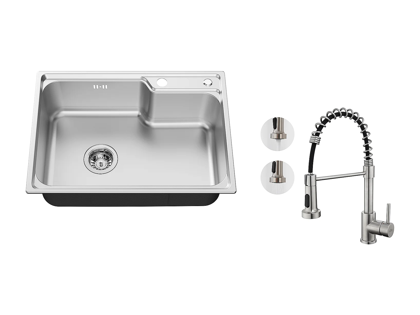 Fregadero Cocina 1Contenedor 62*45*21CM,Acero Inoxidable PVD Nano Lavabo para Colocar,Plata+Grifería Cocina Resorte con Ducha Extensible,Cepillado