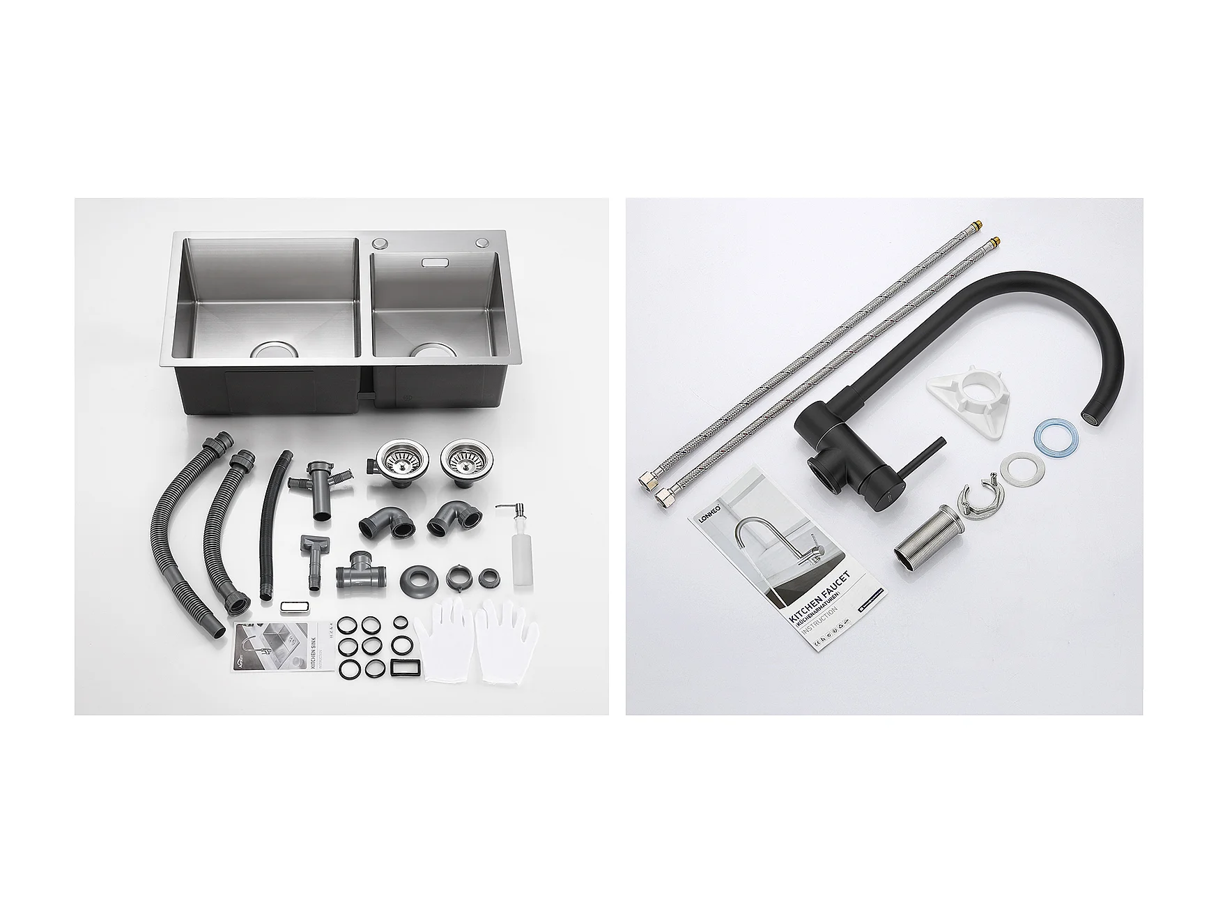 Fregadero Cocina 2 Bandeja 75x45x19cm,Empotrado/para colocar aCon Dispensador jabón+Mezclador cocina Acero inoxidable Plegable Giratorio 360°,Negro