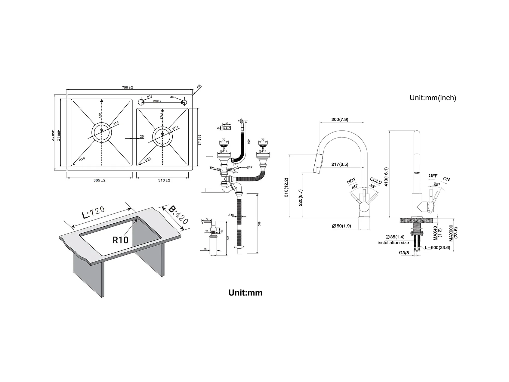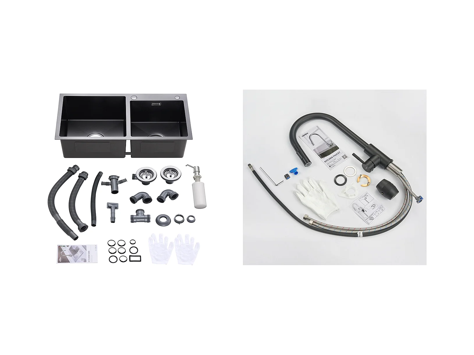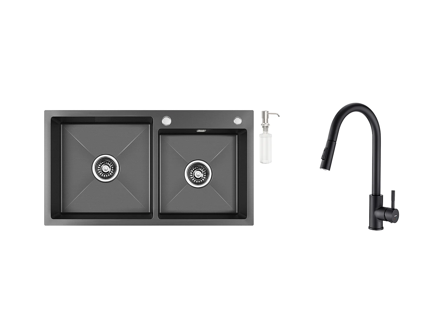 Fregadero Cocina 2 Contenedores,Negro,75x45x19cm,Empotrado/para Colocar conDispensador Jabón+Grifería Cocina Flexible Cece Alto Orientable Libremente