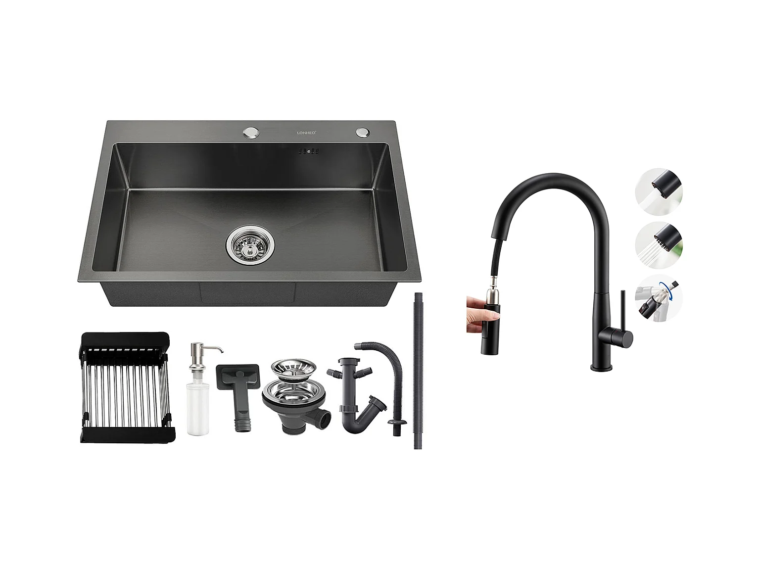 Lonheo Max Fregadero de Cocina Negro 68x45x19CM con Distributor Jabón y Escurridor Cesta+Mezclador CuiSine de Acero Inoxidable 304 Abatible Girante