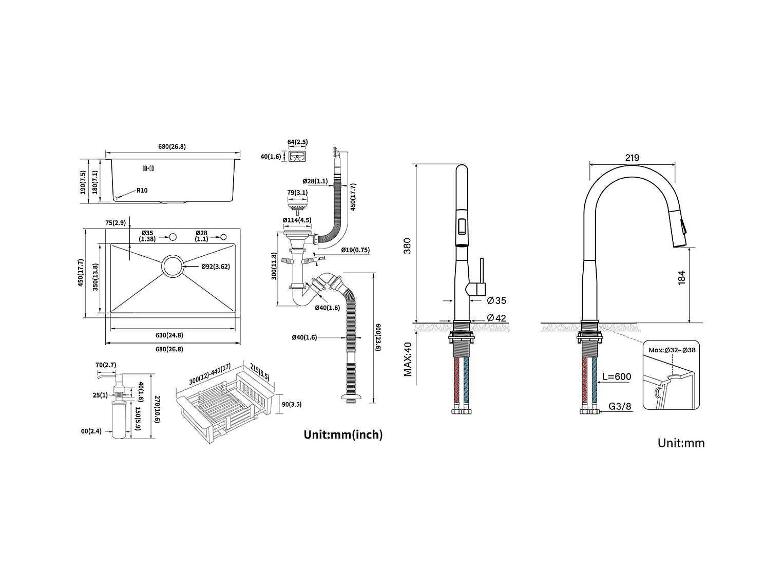 2en1 Fregadero Cocina Negro68x45x19CM con Distributor de jabón y escurridor cesta +Grifo Cocina Flexible Cac Alto Orientable Libremente, Blanco