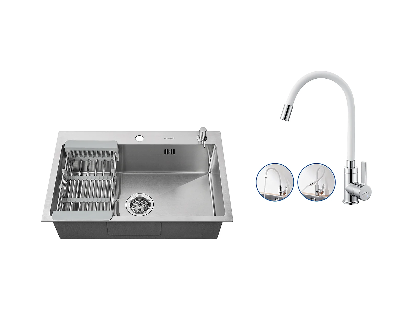Fregadero Cocina Cepillado 68x45x19CM con DistrubUteur jabón escurridor cesta + grifo cocina flexible boco alto orientable libremente, blanco