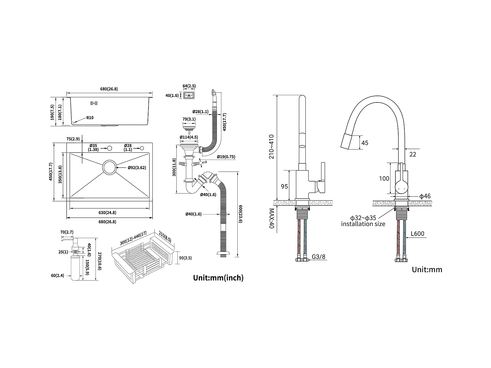 Fregadero Cocina Cepillado 68x45x19CM con Distributor Jabón Escurridor Cesta+Mezclador Cocina de Acero Inoxidable Plegable Girante 360°,Negro