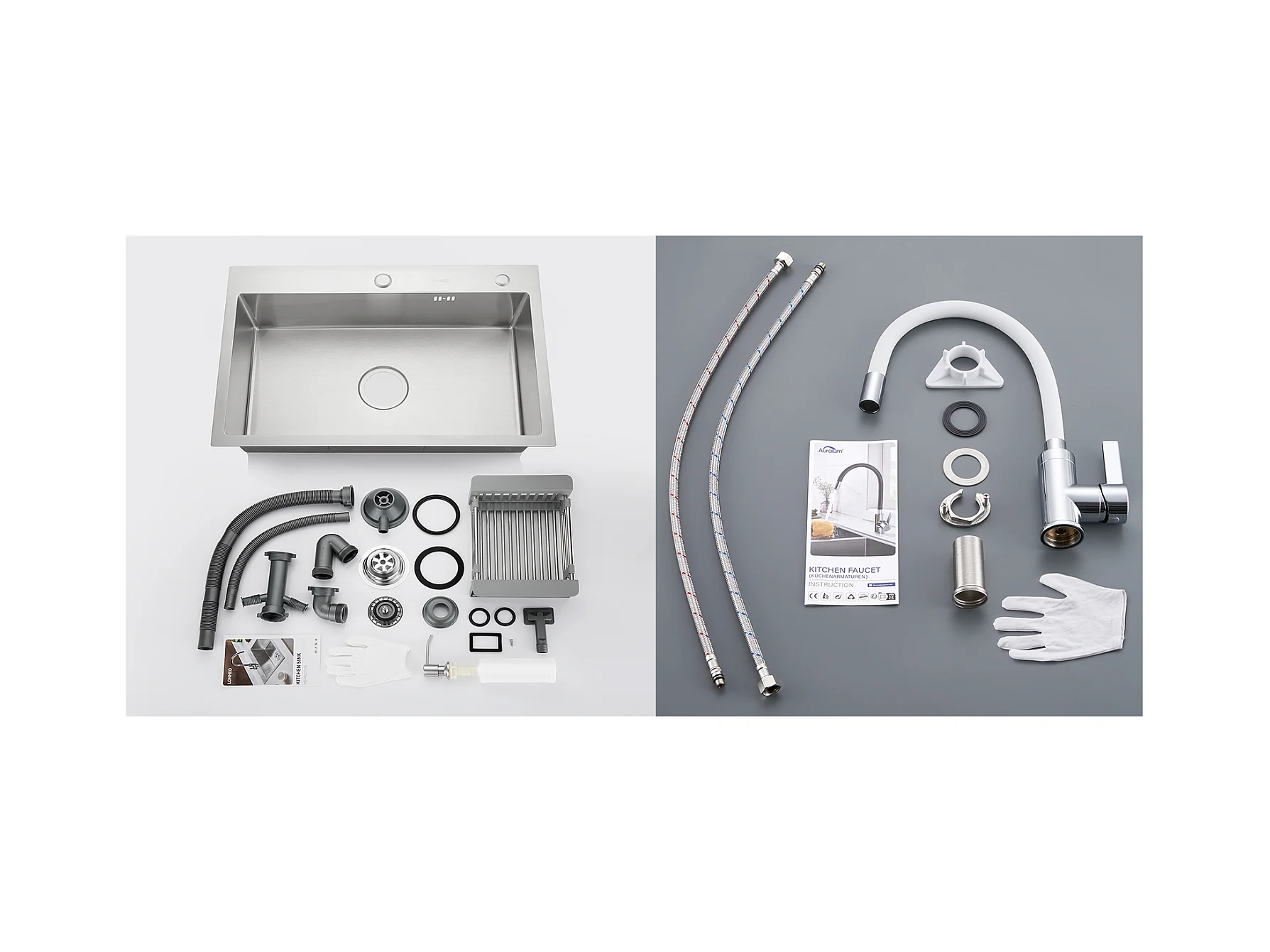 2 en1 Fregadero Cocina Cepillado 68x45x19CM con DistRubón jabón escurridor Cesta+ Grifo de Cocina Inox Extraíble