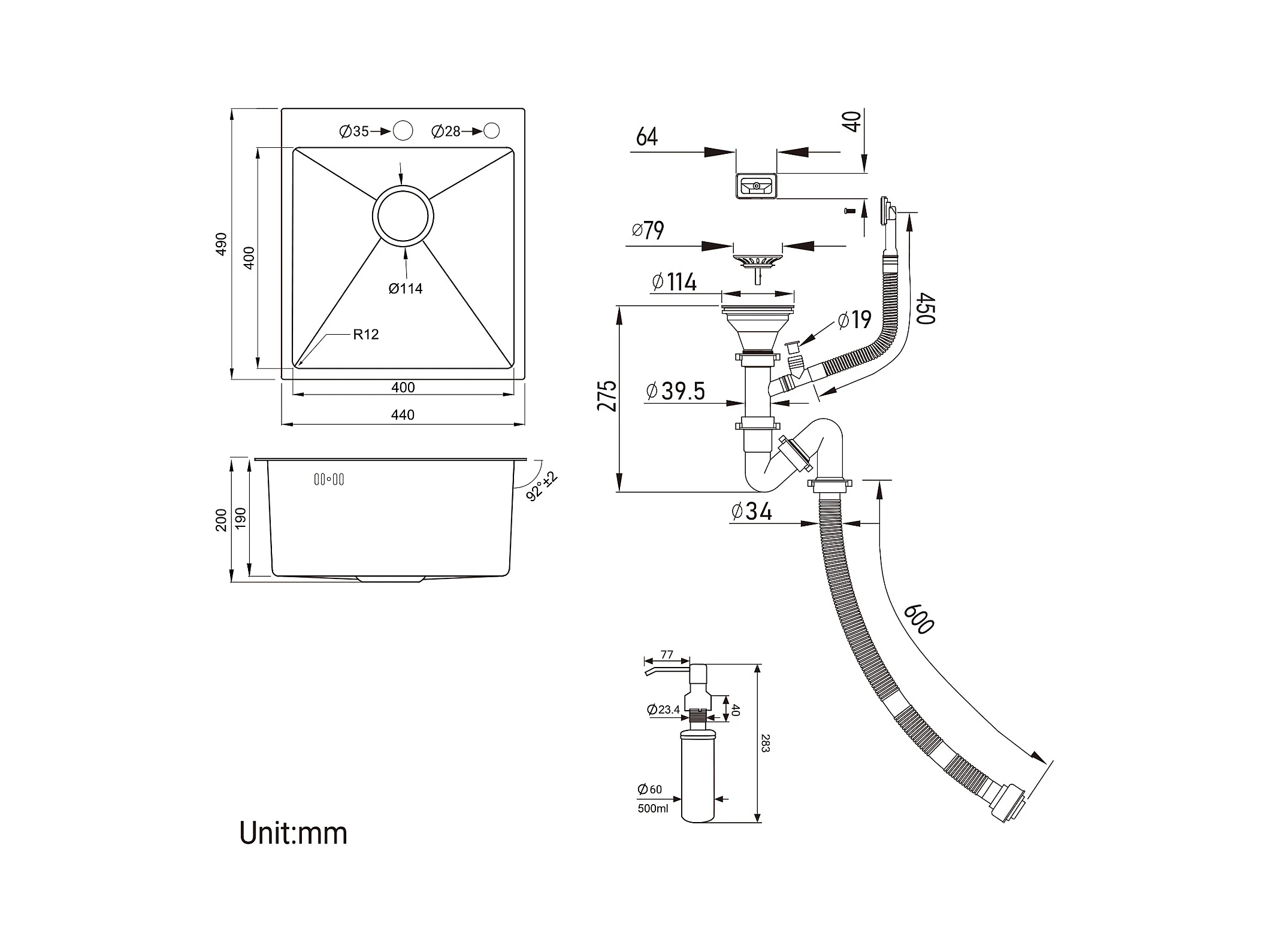 Fregadero de 1 seno,gris-negro,acero inoxidable,44*49*20 CM, con dispensador de jabón, + grifo de cocina negro con ducha extraíble