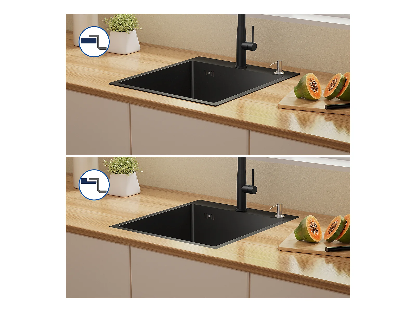 Fregadero de Cocina 1 Bandeja Negro,Inox,44*49*20 CM,con Dispensador de Jabón+Mezclador Cocina Girante de 360°,Barbote Desmontable,Negro
