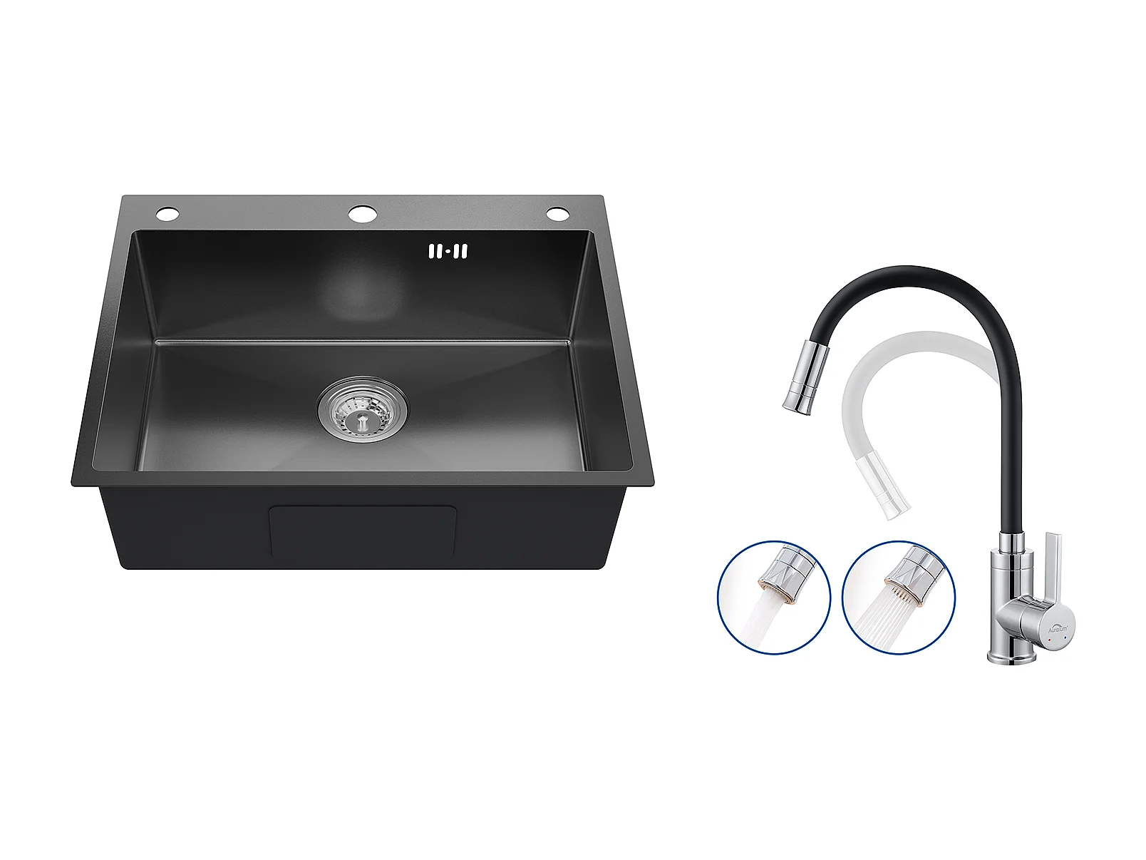 Fregadero Cocina Empotrable,1 Bandeja,60*49*20CM,inox 304,Negro+Mezclador Cocina Negro FlexIble,Grifo cocina plegable, Grifo cocina con 2 tipos Jets