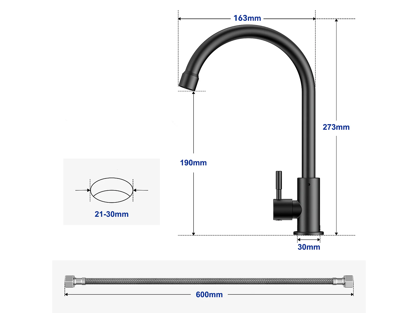 Fregadero de 1 lavabo Fregadero de acero inoxidable plateado de 70 × 45 cm con escurridor, lavabo, dispensador de jabón + grifo de cocina de agua fría, negro