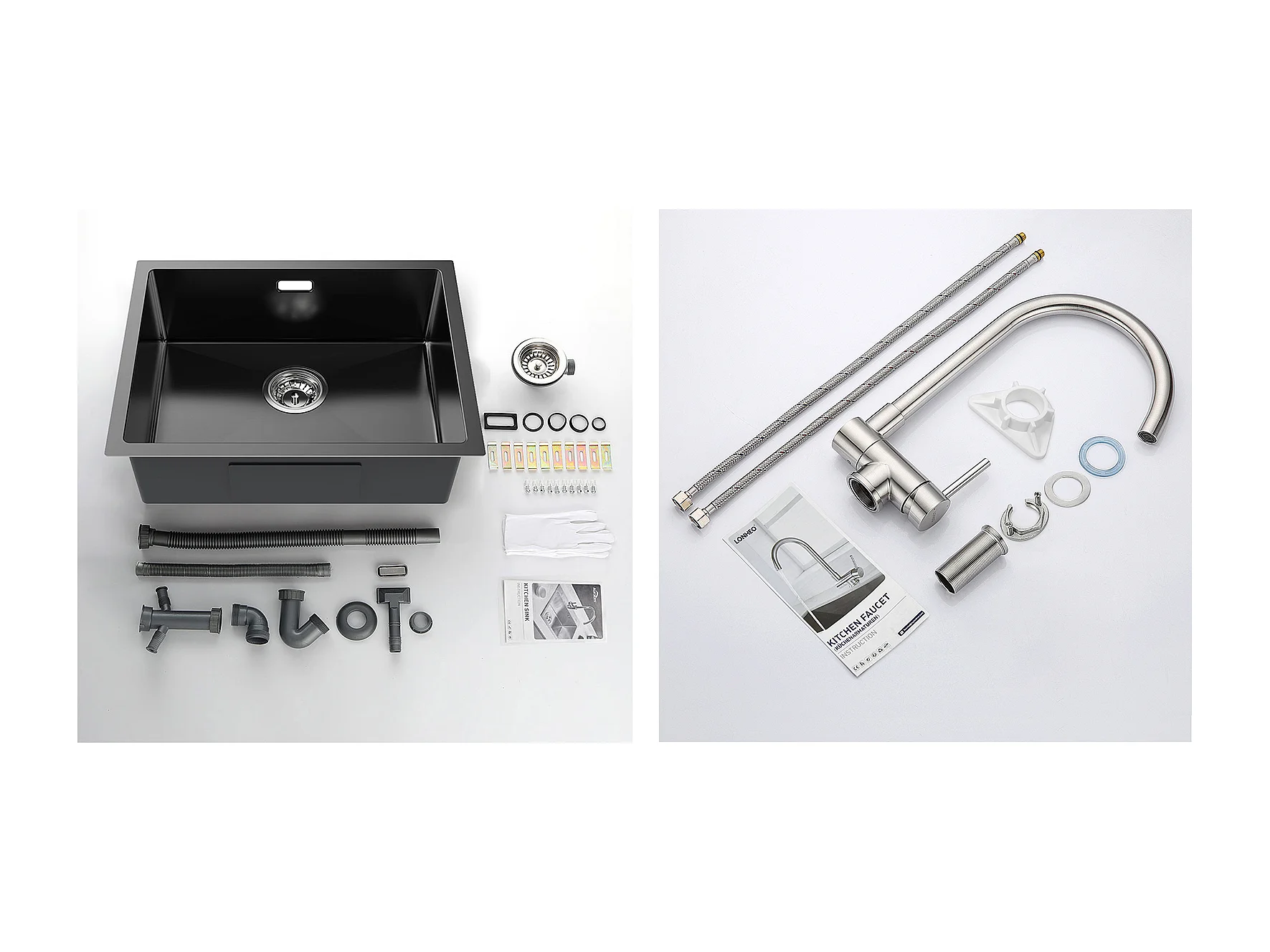Fregadero de Cocina 1 Bandeja 55*44*19CM, Empotrable/Flor/ Sub-Plan, Negro +Mezclador Cocina de Acero Inoxidable 304 Plegable Girante 360°
