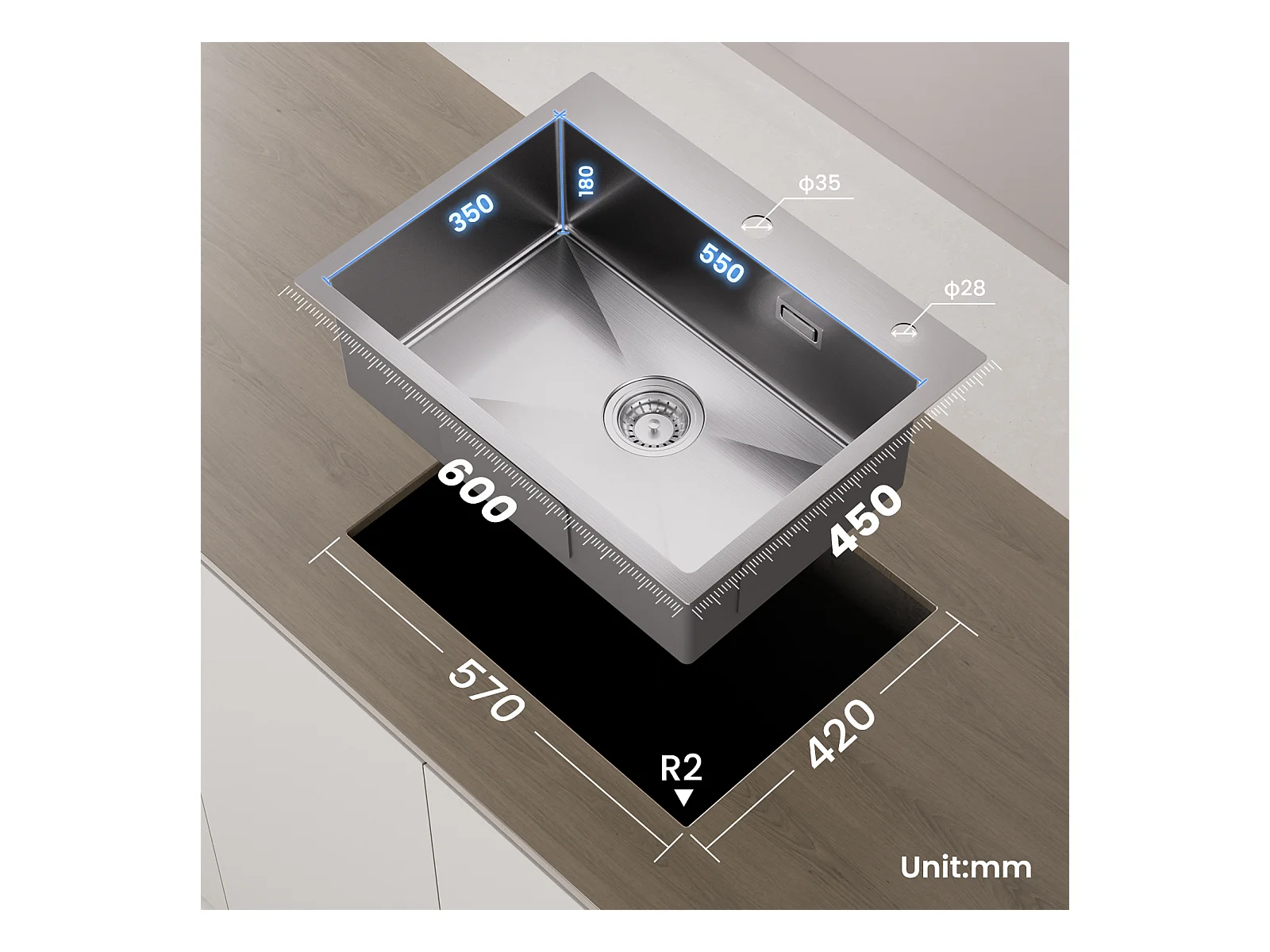 Cecipa max Fregadero de Cocina de 1 Seno 60 × 45 × 18 CM Fregadero de Cocina de Acero Inoxidable Cepillado 304 con Cesta de Drenaje, Modelo UE