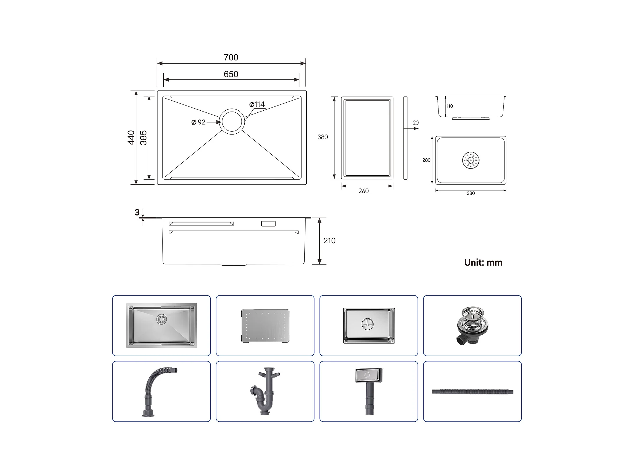Fregadero de cocina Cecipa max 1 lavabo 70×44×21CM Fregadero empotrado de acero inoxidable cepillado con escurridor y lavabo, modelo UE