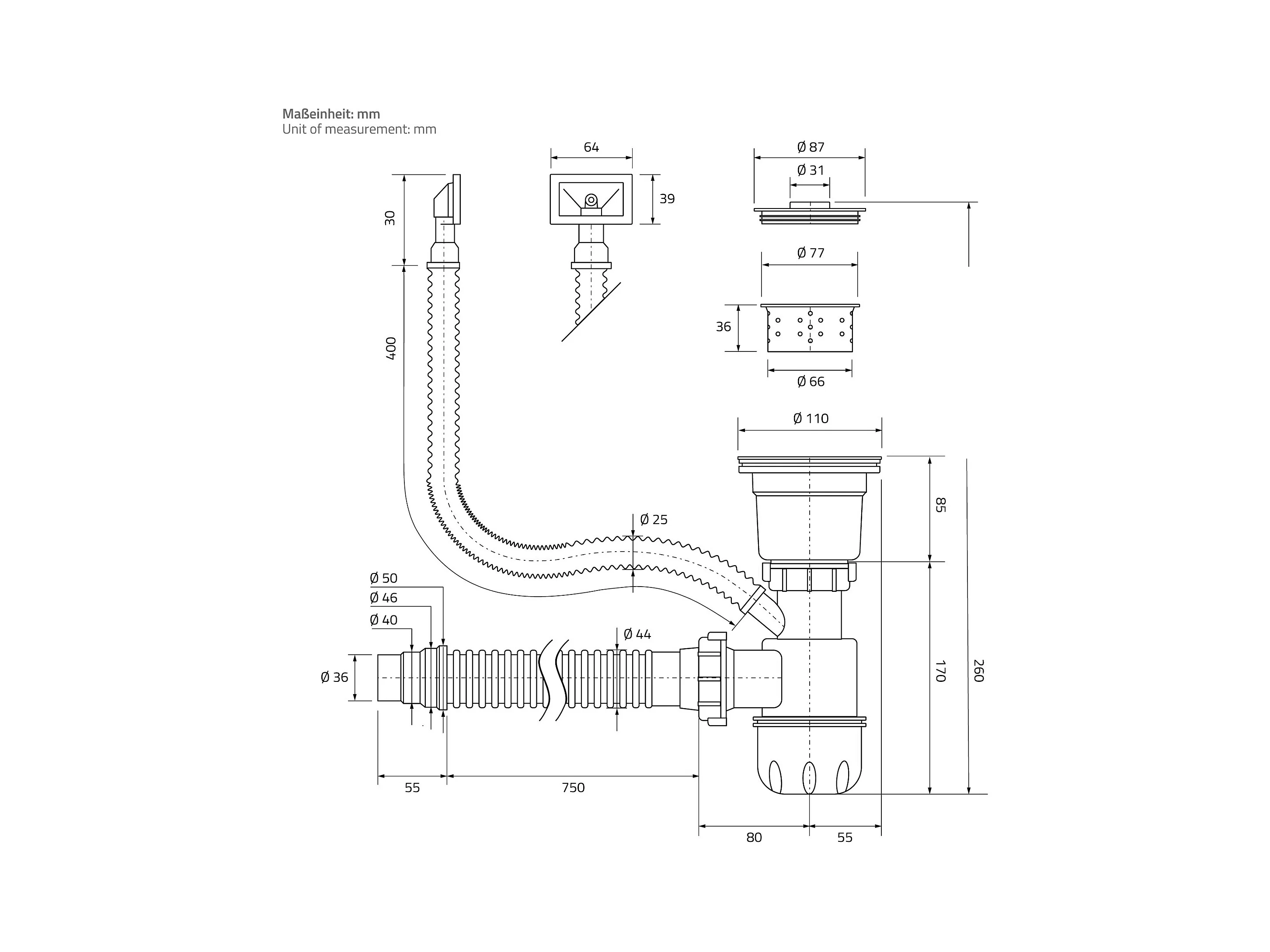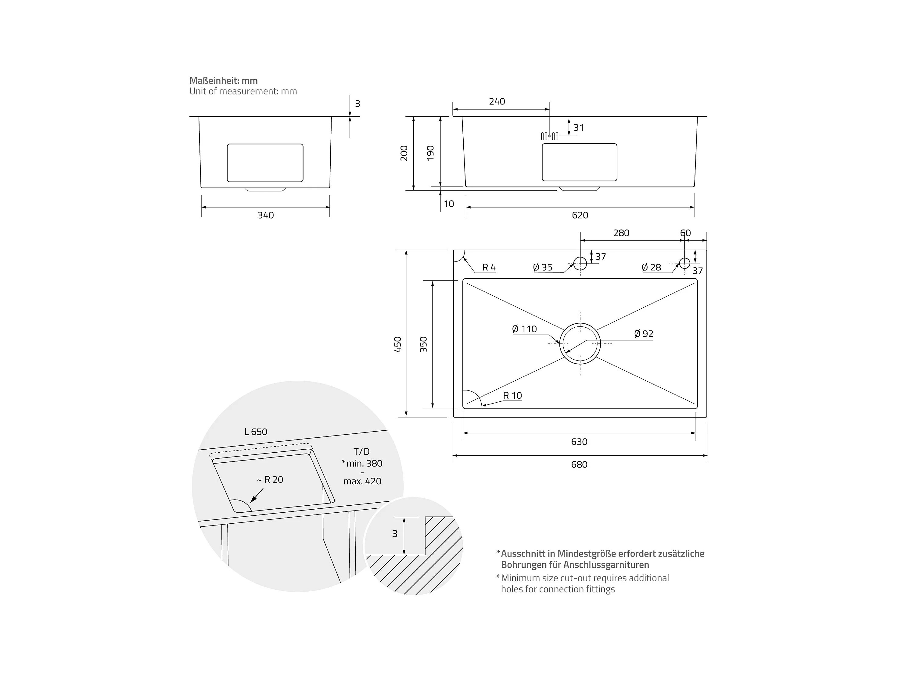 Fregadero de cocina 68x46 cm lavabo rectangular antracita acero con accesorios