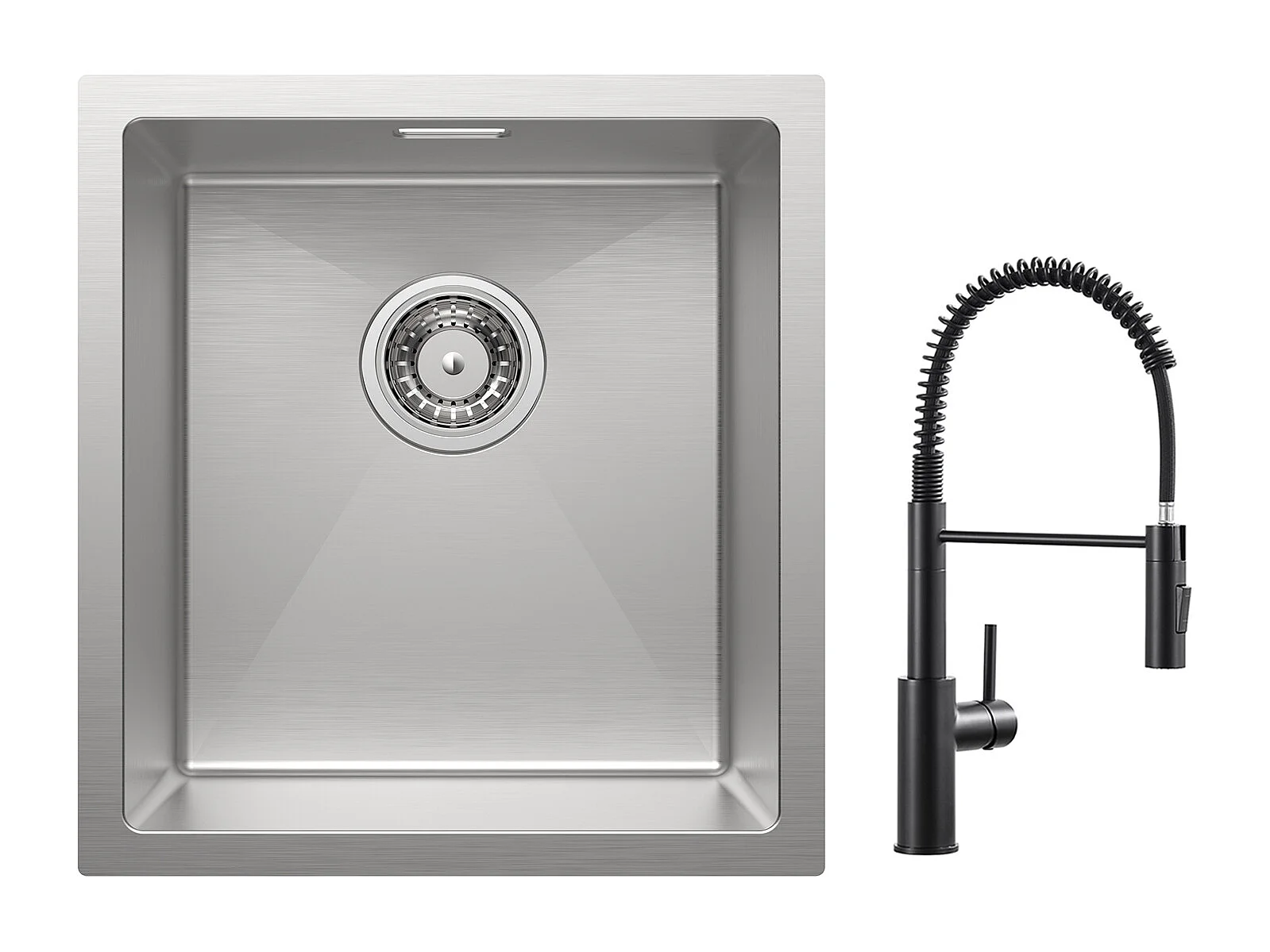 Cecipa MAX Fregadero de cocina 1 seno 40x44x19 cm Fregadero de acero inoxidable cepillado + Mezclador de fregadero giratorio 360° negro