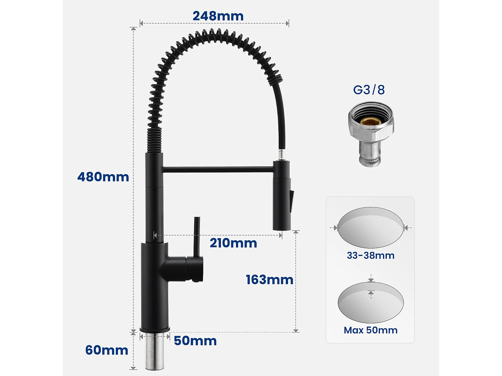 Mezclador Cocina con Ducha Extraíble Negro mate Rotativo a 360 °eN Acero Inoxidable Grifo Cocina Fregadero 2 Funciones Mezclador Cocina