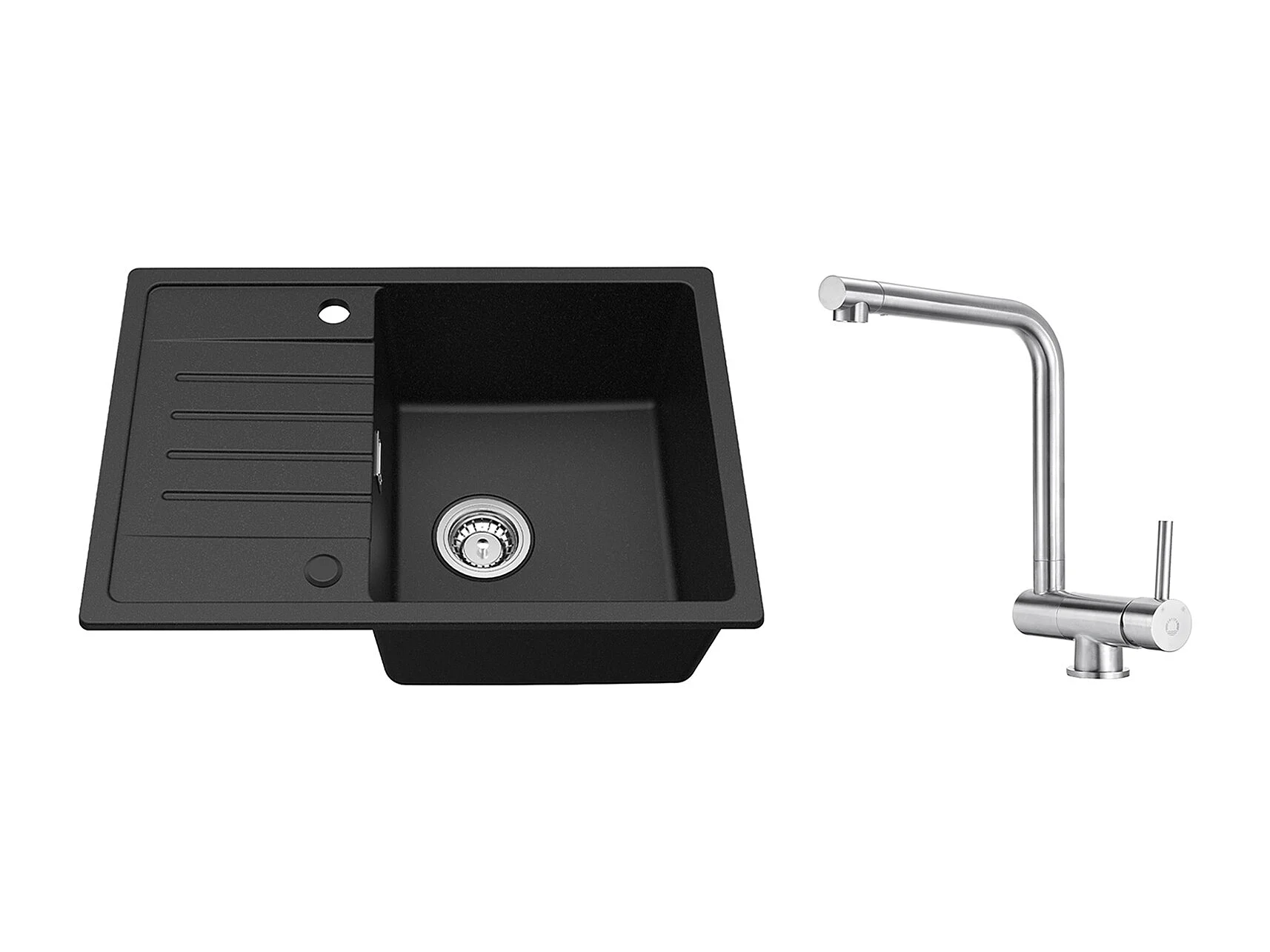 Fregadero encastrable de 1 seno con escurridor negro, cuarzo y resina, 65x45 cm + grifo de cocina monomando de acero inoxidable cepillado