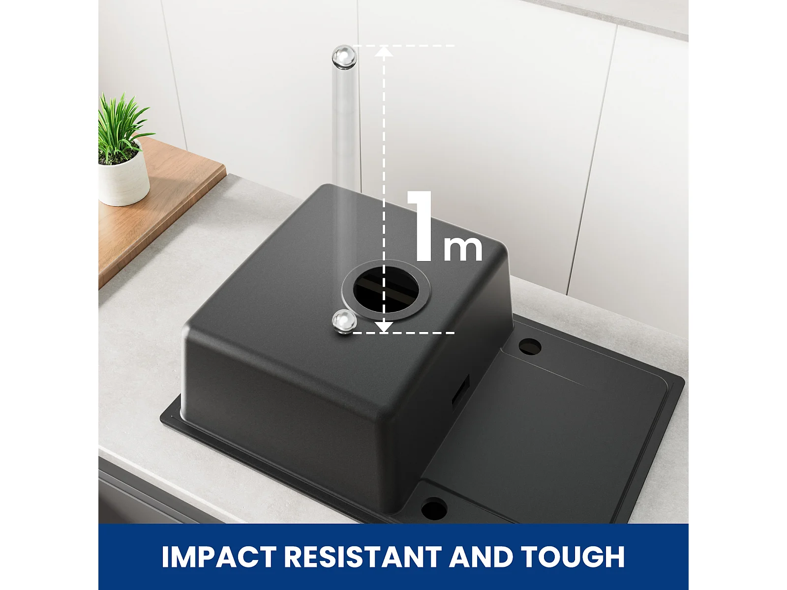 Cecipa max Fregadero encastrable de 1 lavabo con escurridor, cuarzo y resina, negro 65x45cm Fregadero de 1 lavabo en granito de cuarzo, modelo UE