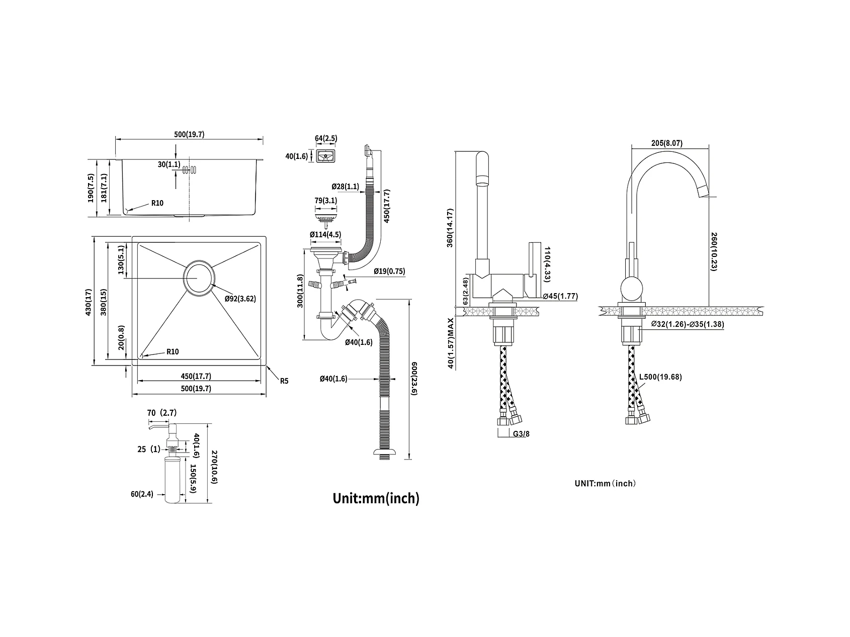 Fregadero Negro 1 Bandeja 50x43x18,5CM,Acero Inoxidable, con Distributor Jabón+Grifo Cocina Flexible Boco Alto Orientable Libremente,Blanco