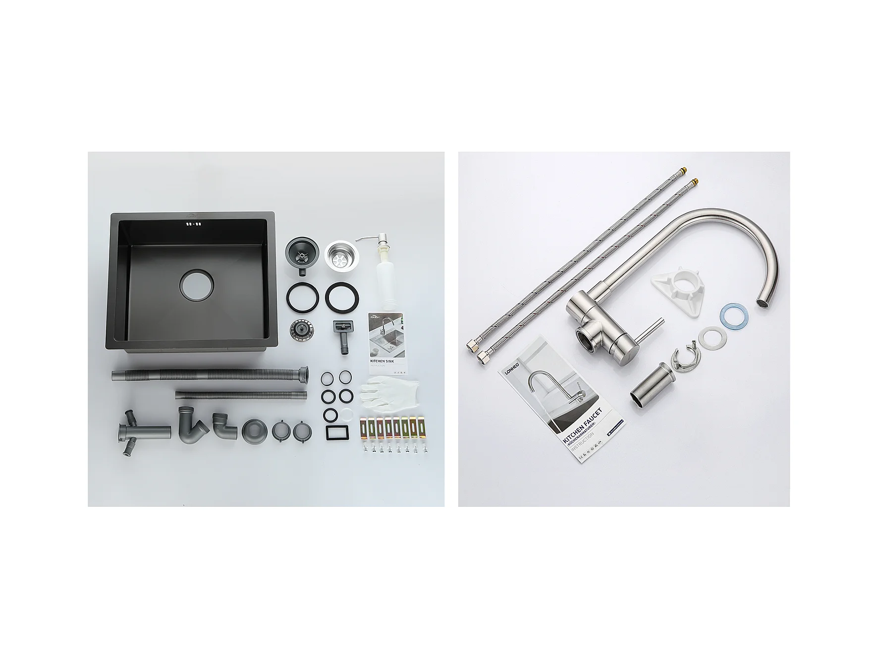Fregadero Negro 1 Bandeja 50x43x18,5CM, Acero Inoxidable, con Distributor de Jabón+Grifo Cocina Ducha Extragible Gris Oscuro Rotativo 360 °