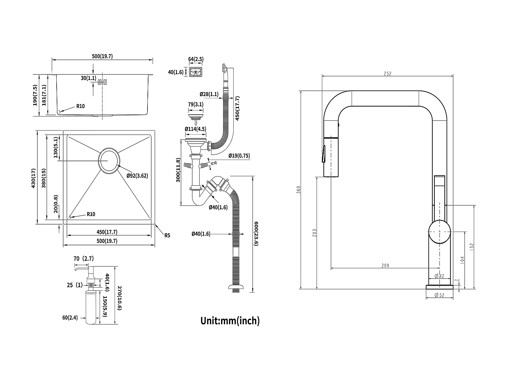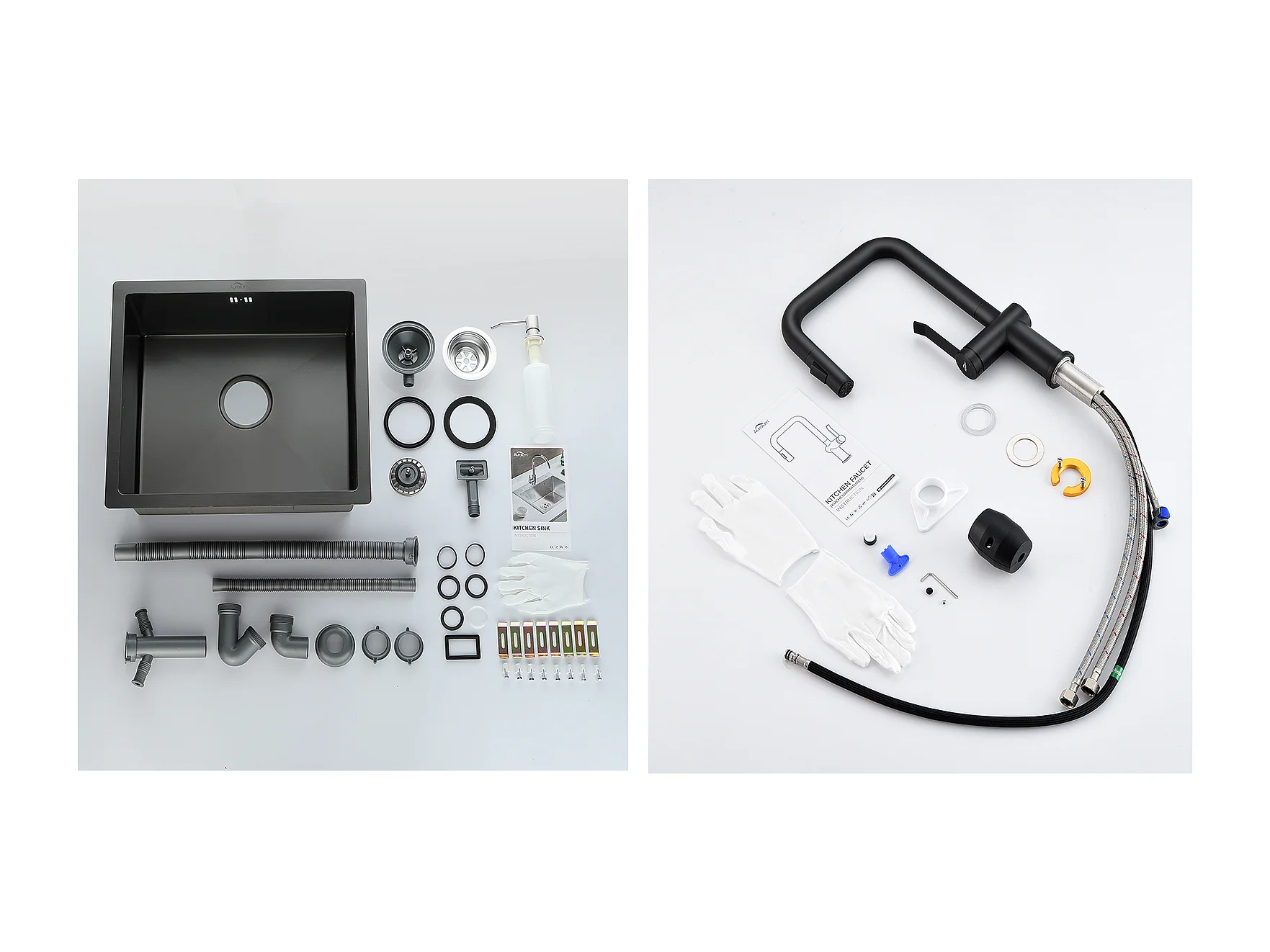 Fregadero Negro 1 Bandeja 50x43x18,5CM, Acero Inoxidable, Distributor de Jabón+Grifo de Cocina con Ducha Extragible Rotativa 360 °2 Fon