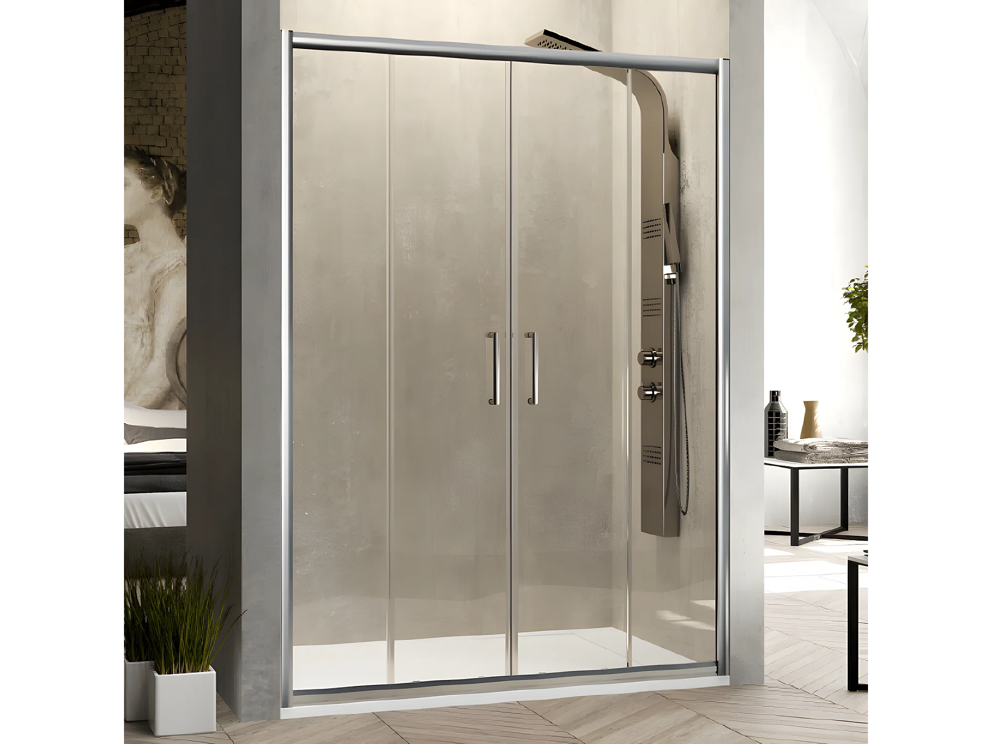 Frontal de ducha 2 Fijos Lateral Fijo : 67 - 69 cm + 2 Puertas Correderas 180 cm 180 cm BELLA Lateral Fijo : 67 - 69 cm