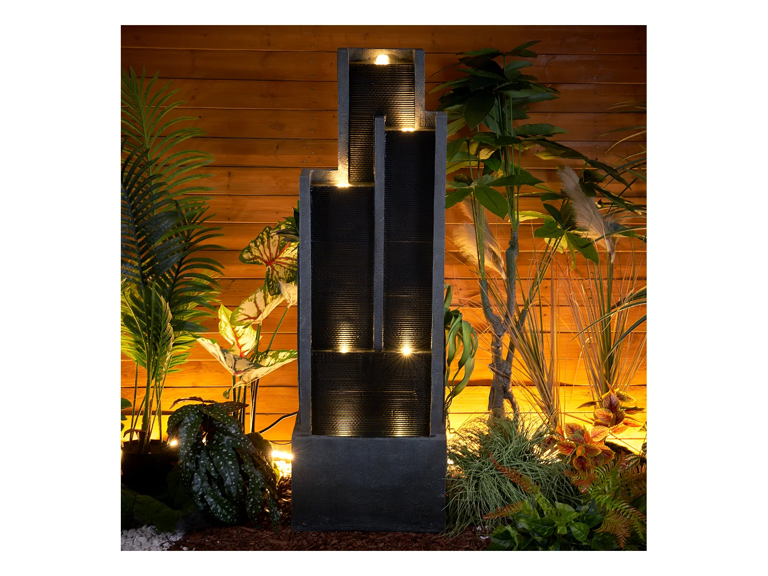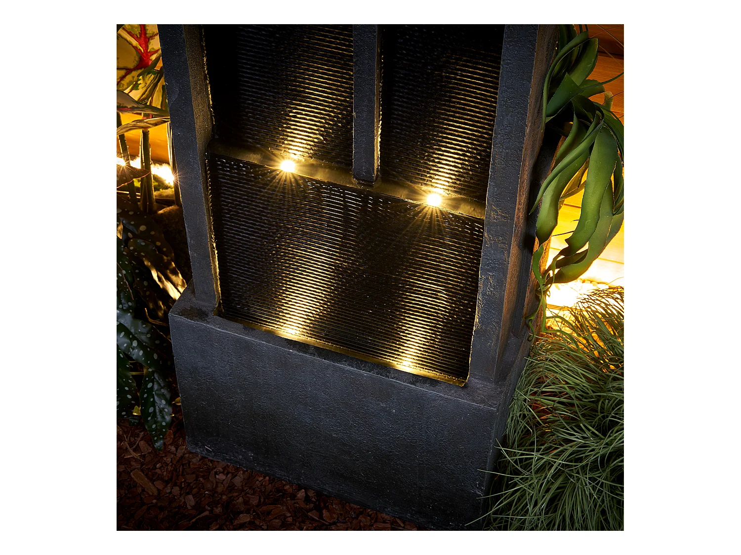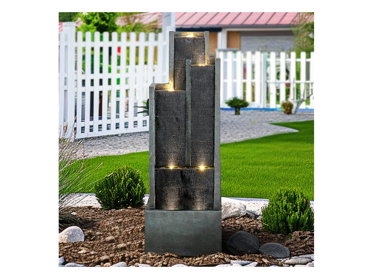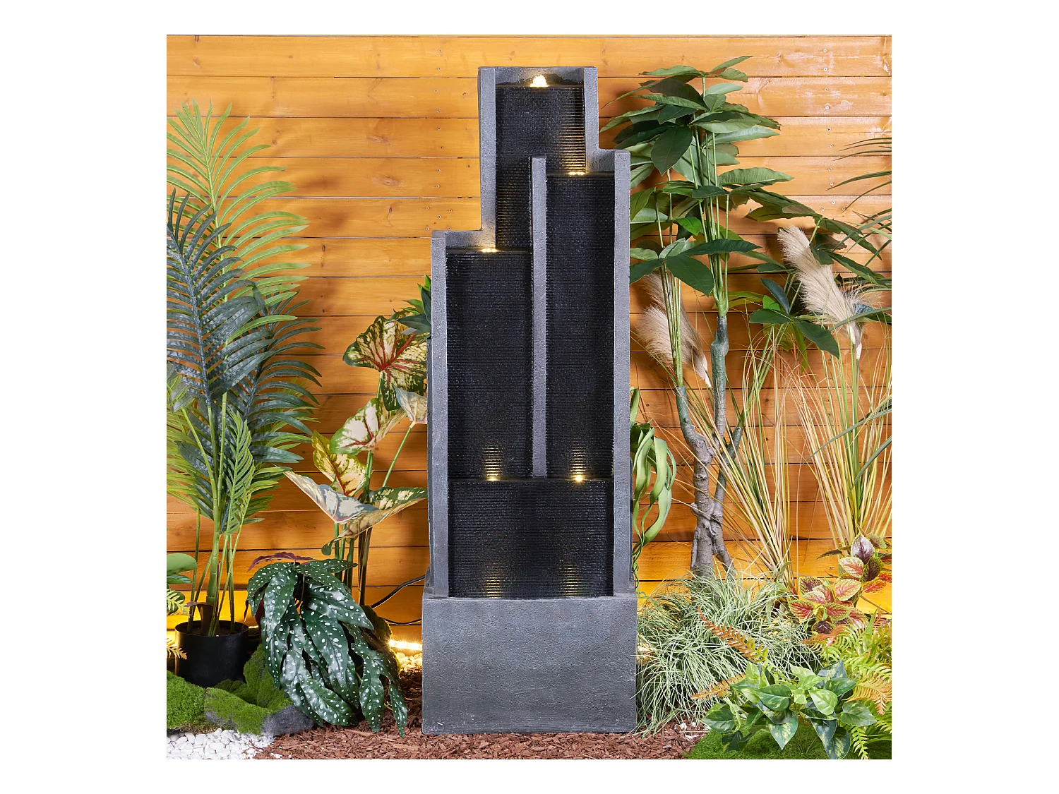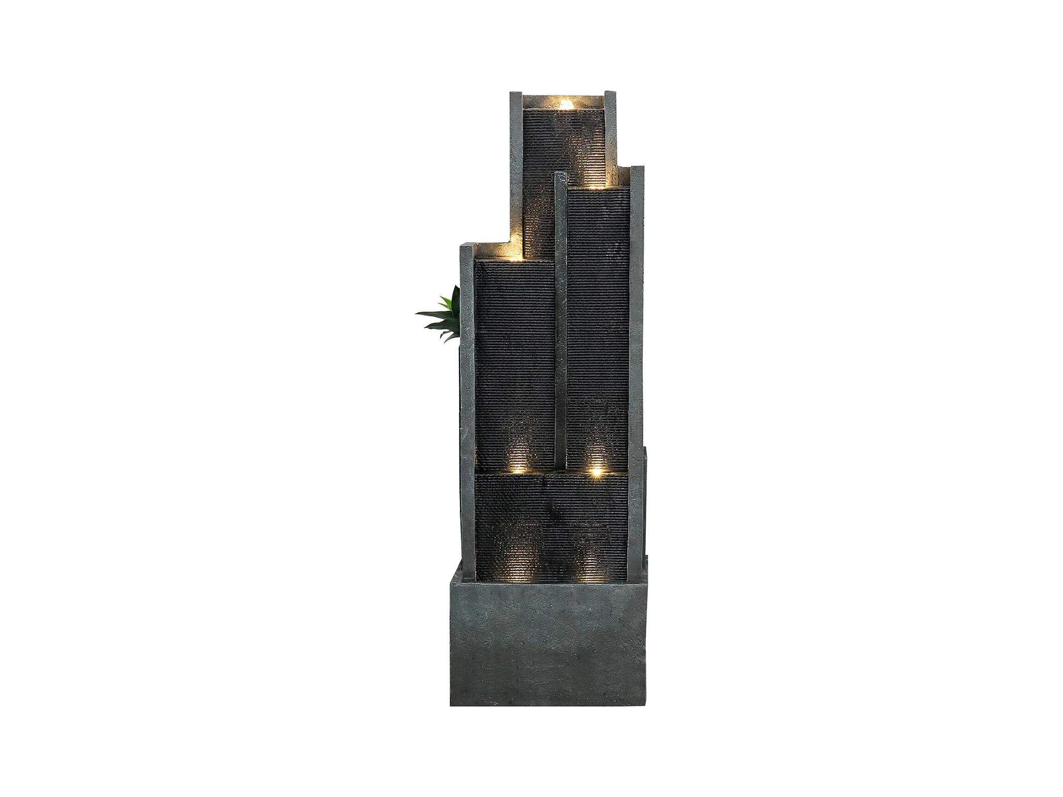 Fuente de agua de pared moderna, diseño elegante, resina sintética, color negro y gris, con iluminación LED y efecto relajante (43x25x128 cm)