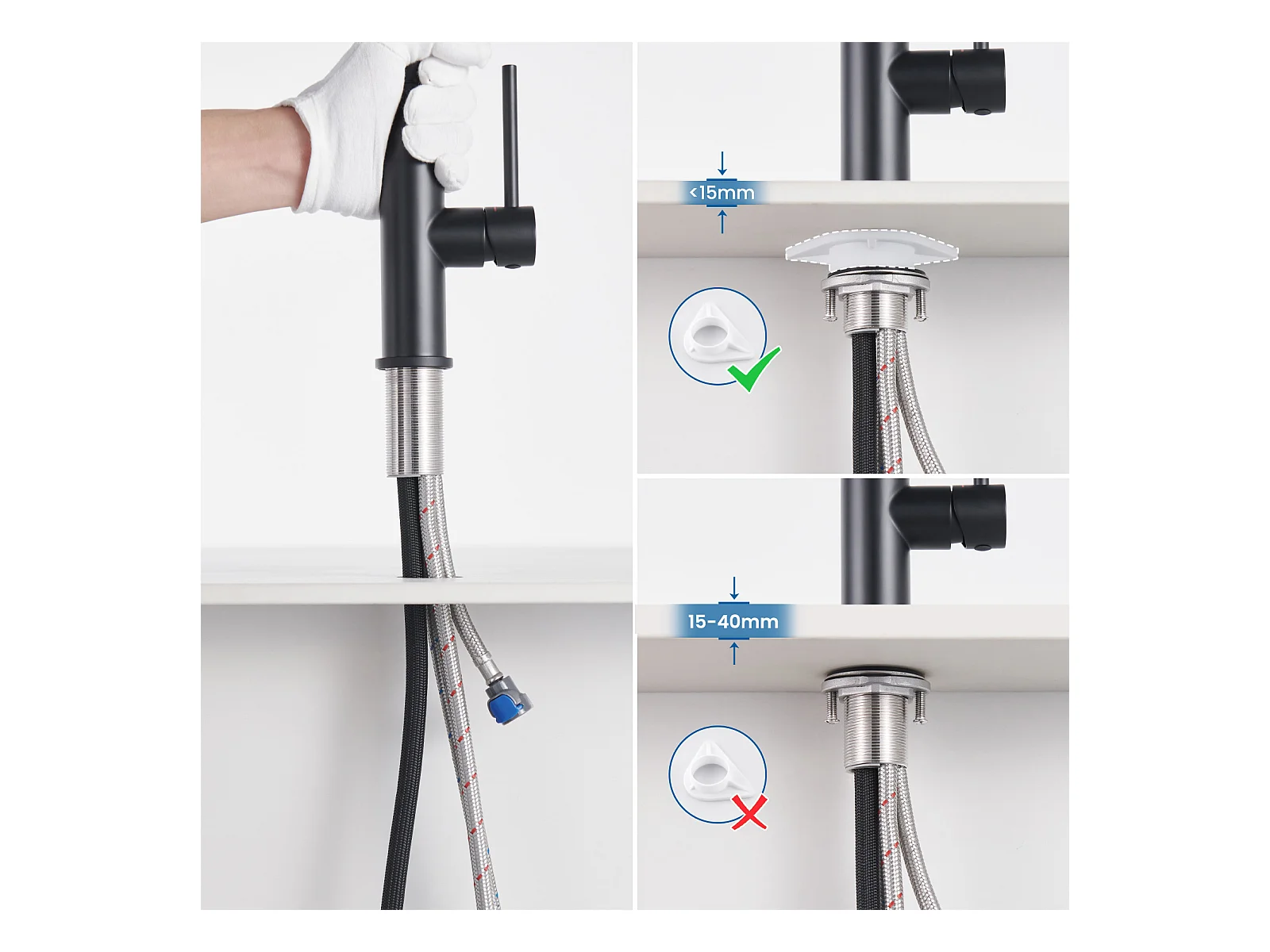 Fregadero de 1 cubeta de cuarzo y resina, 3 opciones de montaje, 40*44*20cm + Mezclador de cocina plegable negro