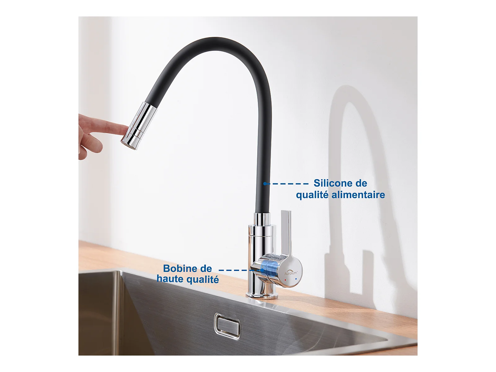 AuraLumMax Mezclador de CCocina con Ducha Extraíble,2 Modos Jet, Grifo Cocina Rotativo 360°,Agua Caliente/Fría,Cartucho de Cerámica, Negro,Modelo UE