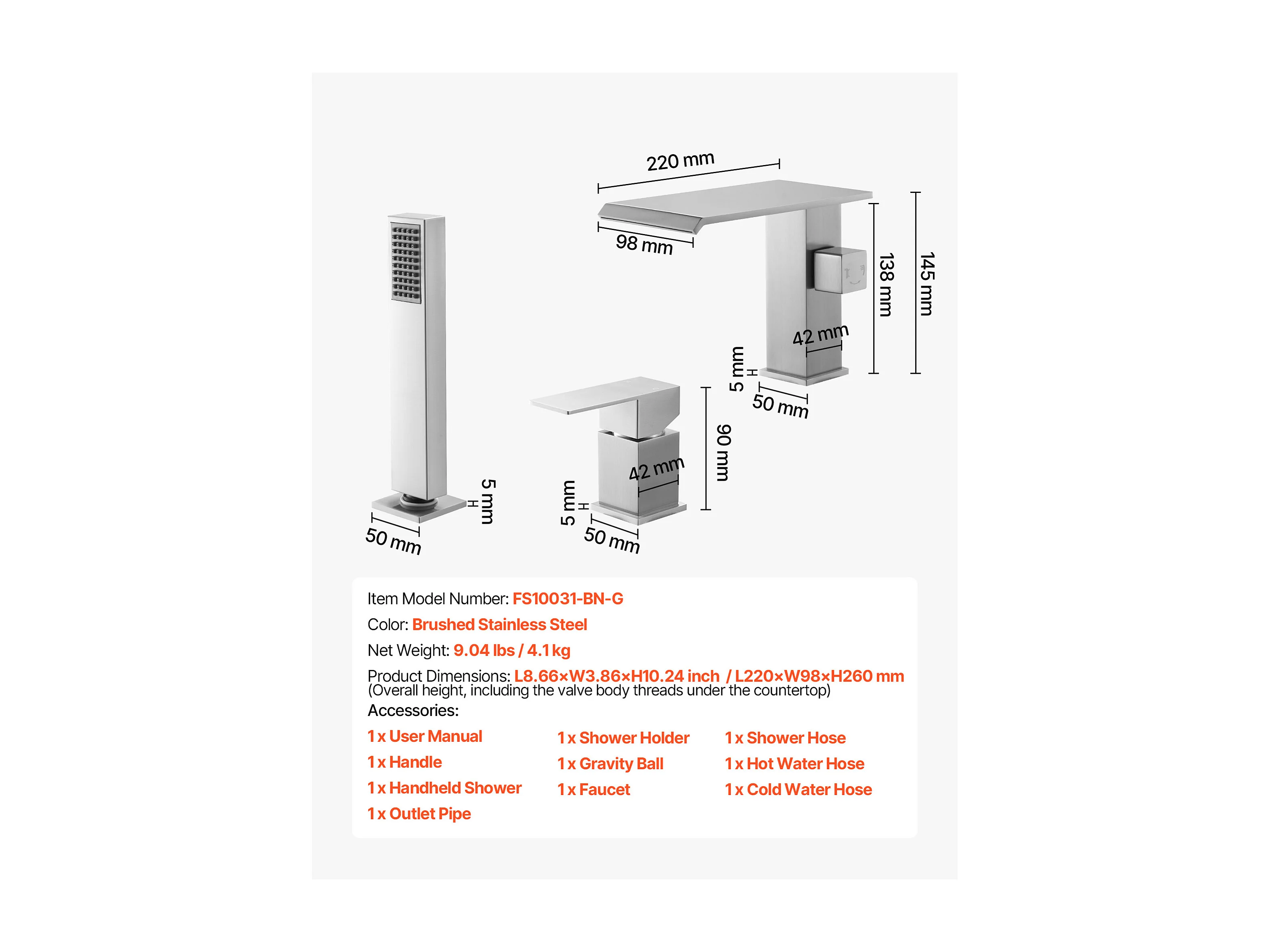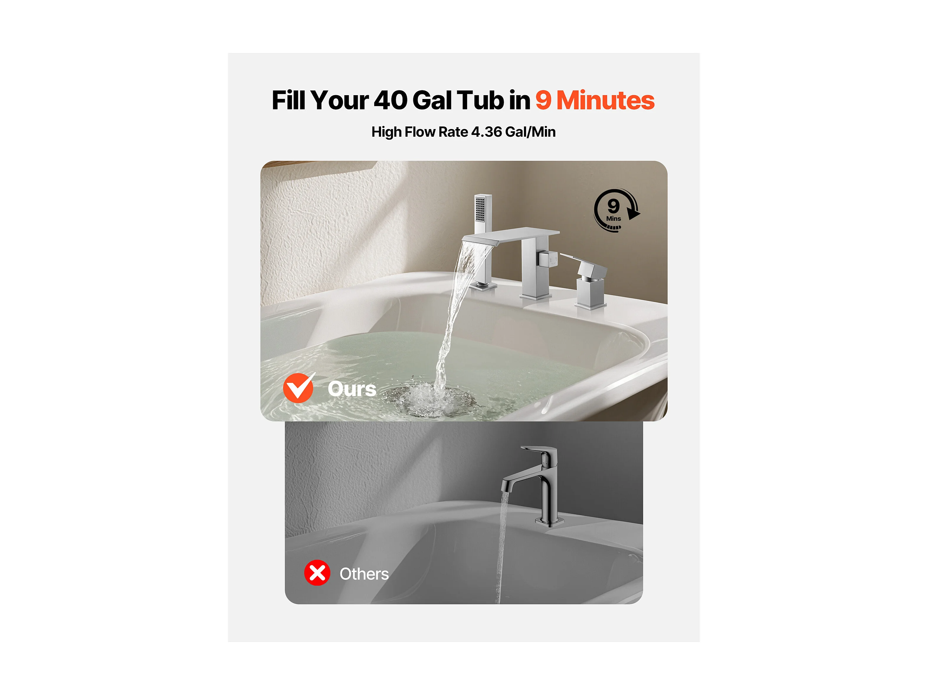 Grifo de Bañera Romana SucceBuy, Grifo de Baño 3 Agujeros, Cascada, con Cabezal de Ducha y 1 Asa, en Acero Inoxidable Cepillado, para Cuarto de Baño