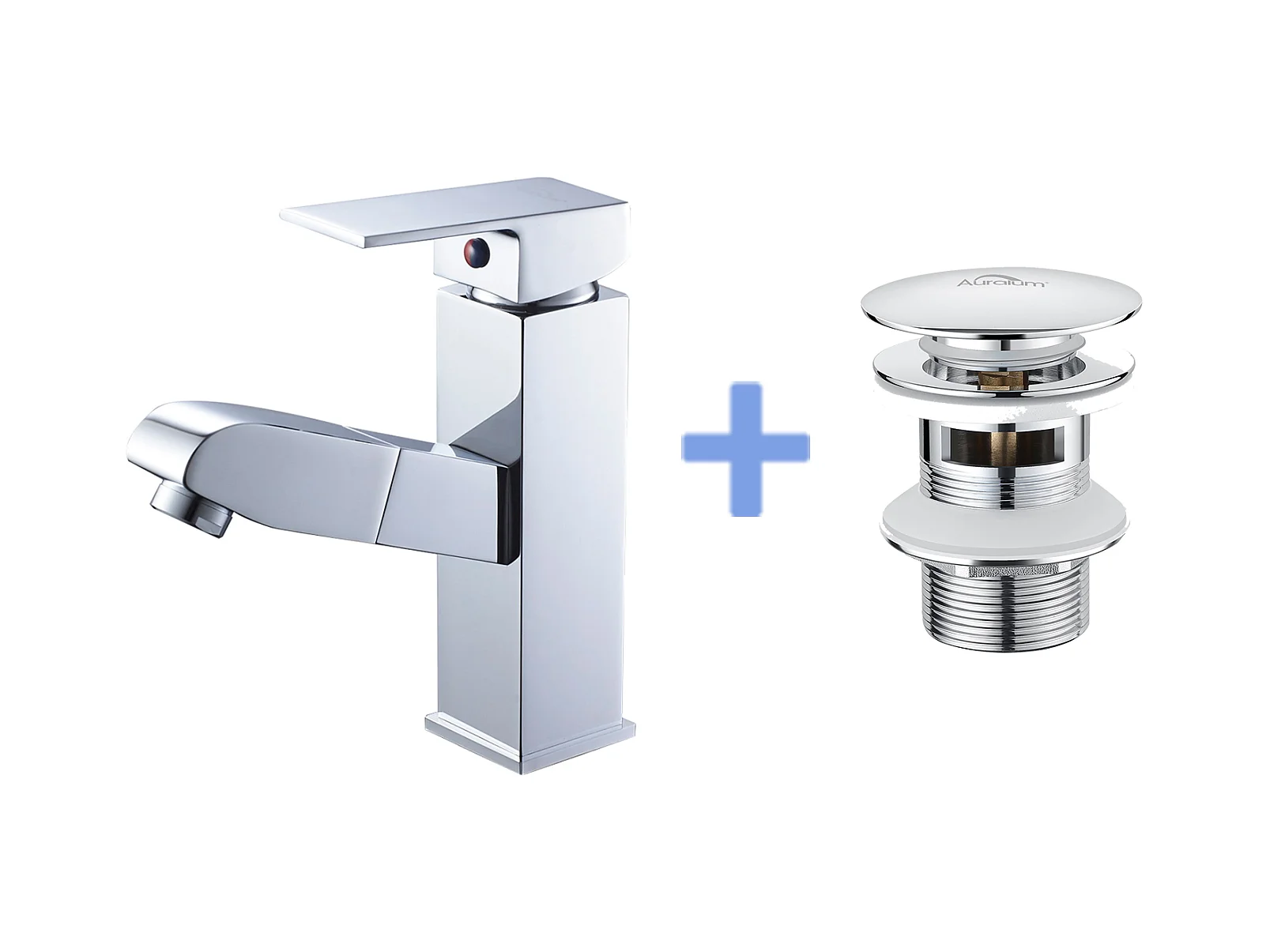 Auralum Max Mezclador Lavabo Monoagujero con Tirador de Vaciado,Bonde Incluido, Cromado+60cm Toallero Baño Autoadhesivo o Perforación de Inox 304
